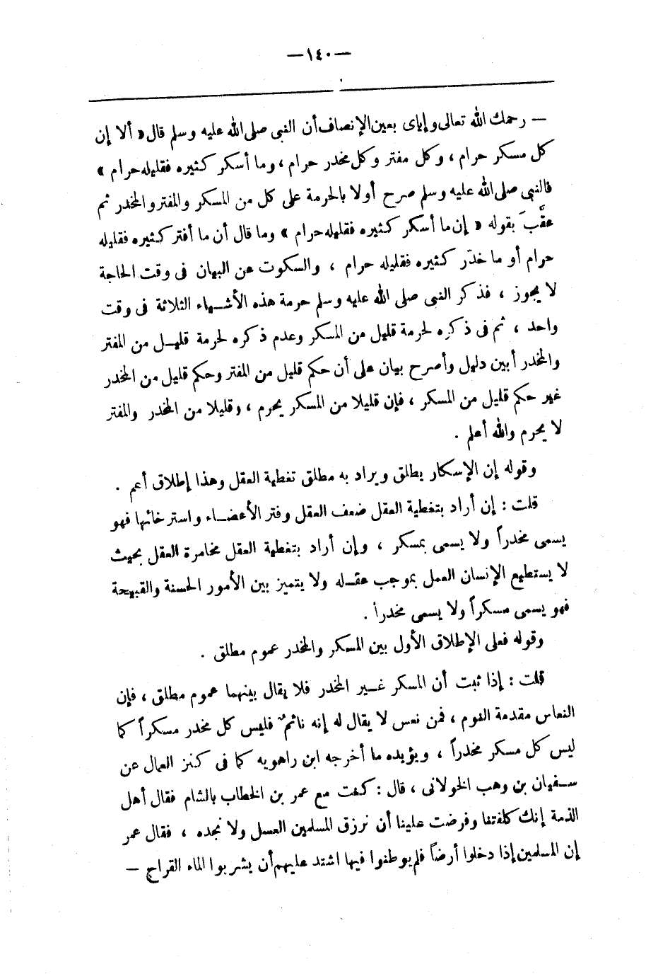 رَحِمَك اللَّه تَعَالَى وَإِيَّايَ بِعَيْنِ الْإِنْصَاف أَنَّ النَّبِيّ صَلَّى اللَّه عَلَيْهِ وَسَلَّمَ قَالَ " أَلَا إِنَّ كُلّ مُسْكِر حَرَام ، وَكُلّ مُفَتِّر وَكُلّ مُخَدِّر حَرَام ، وَمَا أَسْكَرَ كَثِيره فَقَلِيله حَرَام " فَالنَّبِيّ صَلَّى اللَّه عَلَيْهِ وَسَلَّمَ صَرَّحَ أَوَّلًا بِالْحُرْمَةِ عَلَى كُلّ مِنْ الْمُسْكِر وَالْمُفَتِّر وَالْمُخَدِّر ثُمَّ عَقَّبَ بِقَوْلِهِ " إِنَّ مَا أَسْكَرَ كَثِيره فَقَلِيله حَرَام " وَمَا قَالَ إِنَّ مَا أَفْتَرَ كَثِيره فَقَلِيله حَرَام أَوْ مَا خَدَّرَ كَثِيره فَقَلِيله حَرَام ، وَالسُّكُوت عَنْ الْبَيَان فِي وَقْت الْحَاجَة لَا يَجُوز ، فَذَكَرَ النَّبِيّ صَلَّى اللَّه عَلَيْهِ وَسَلَّمَ حُرْمَة هَذِهِ الْأَشْيَاء الثَّلَاثَة فِي وَقْت وَاحِد ، ثُمَّ فِي ذِكْره لِحُرْمَةِ قَلِيل مِنْ الْمُسْكِر وَعَدَم ذِكْره لِحُرْمَةِ قَلِيل مِنْ الْمُفَتِّر وَالْمُخَدِّر أَبْيَنُ دَلِيل وَأَصْرَحُ بَيَان عَلَى أَنَّ حُكْم قَلِيل مِنْ الْمُفَتِّر وَحُكْم قَلِيل مِنْ الْمُخَدِّر غَيْر حُكْم قَلِيل مِنْ الْمُسْكِر ، فَإِنَّ قَلِيلًا مِنْ الْمُسْكِر يَحْرُم ، وَقَلِيلًا مِنْ الْمُخَدِّر وَالْمُفَتِّر لَا يَحْرُم وَاَللَّه أَعْلَمُ .