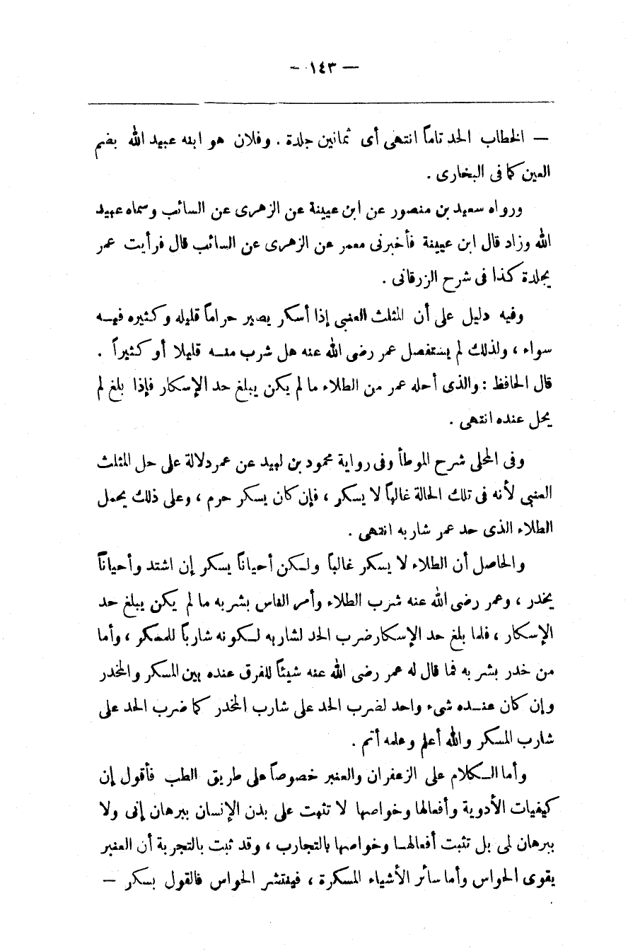 وَأَمَّا الْكَلَام عَلَى الزَّعْفَرَان وَالْعَنْبَر خُصُوصًا عَلَى طَرِيق الطِّبّ فَأَقُول : إِنَّ كَيْفِيَّات الْأَدْوِيَة وَأَفْعَالهَا وَخَوَاصّهَا لَا تَثْبُت عَلَى بَدَن الْإِنْسَان بِبُرْهَانٍ إِنِّيّ وَلَا بِبُرْهَانٍ لَمِّيّ بَلْ تَثْبُت أَفْعَالهَا وَخَوَاصّهَا بِالتَّجَارِبِ ، وَقَدْ ثَبَتَ بِالتَّجْرِبَةِ أَنَّ الْعَنْبَر يُقَوِّي الْحَوَاسّ وَأَمَّا سَائِر الْأَشْيَاء الْمُسْكِرَة فَيَنْتَشِر فِي الْحَوَاسّ فَالْقَوْل بِسُكْرِ@