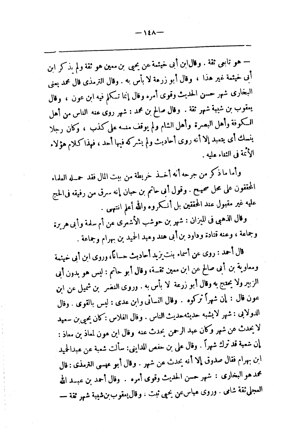 قَالَ أَحْمَد : رَوَى عَنْ أَسْمَاء بِنْت يَزِيد أَحَادِيثَ حِسَانًا ، وَرَوَى اِبْن أَبِي خَيْثَمَةَ وَمُعَاوِيَة اِبْن أَبِي صَالِح عَنْ اِبْن مَعِين ثِقَة ، وَقَالَ أَبُو حَاتِم : لَيْسَ هُوَ بِدُونِ أَبِي الزُّبَيْر وَلَا يُحْتَجّ بِهِ وَقَالَ أَبُو زُرْعَة لَا بَأْس بِهِ . وَرَوَى النَّضْر بْن شُمَيْلٍ عَنْ اِبْن عَوْن قَالَ : إِنَّ شَهْرًا تَرَكُوهُ . وَقَالَ النَّسَائِيُّ وَابْن عَدِيّ : لَيْسَ بِالْقَوِيِّ . وَقَالَ الدُّولَابِيّ : شَهْر لَا يُشْبِه حَدِيثه حَدِيث النَّاس . وَقَالَ الْفَلَّاسُ : كَانَ يَحْيَى بْن سَعِيد لَا يُحَدِّث عَنْ شَهْر وَكَانَ عَبْد الرَّحْمَن يُحَدِّث عَنْهُ وَقَالَ اِبْن عَوْن لِمُعَاذِ بْن مُعَاذ : إِنَّ شُعْبَة قَدْ تَرَكَ شَهْرًا . وَقَالَ عَلِيّ بْن حَفْص الْمَدَايِنِيّ : سَأَلْت شُعْبَة عَنْ عَبْد الْحَمِيد بْن بَهْرَام فَقَالَ صَدُوق إِلَّا أَنَّهُ يُحَدِّث عَنْ شَهْر . وَقَالَ أَبُو عِيسَى التِّرْمِذِيّ : قَالَ مُحَمَّد وَهُوَ الْبُخَارِيّ : شَهْر حَسَن الْحَدِيث وَقَوِيٌّ أَمْرُهُ . وَقَالَ أَحْمَد بْن عَبْد اللَّه الْعِجْلِيُّ ثِقَة شَامِيّ . وَرَوَى عَبَّاس عَنْ يَحْيَى ثَبْت . وَقَالَ يَعْقُوب بْن شَيْبَة شَهْر ثِقَة @