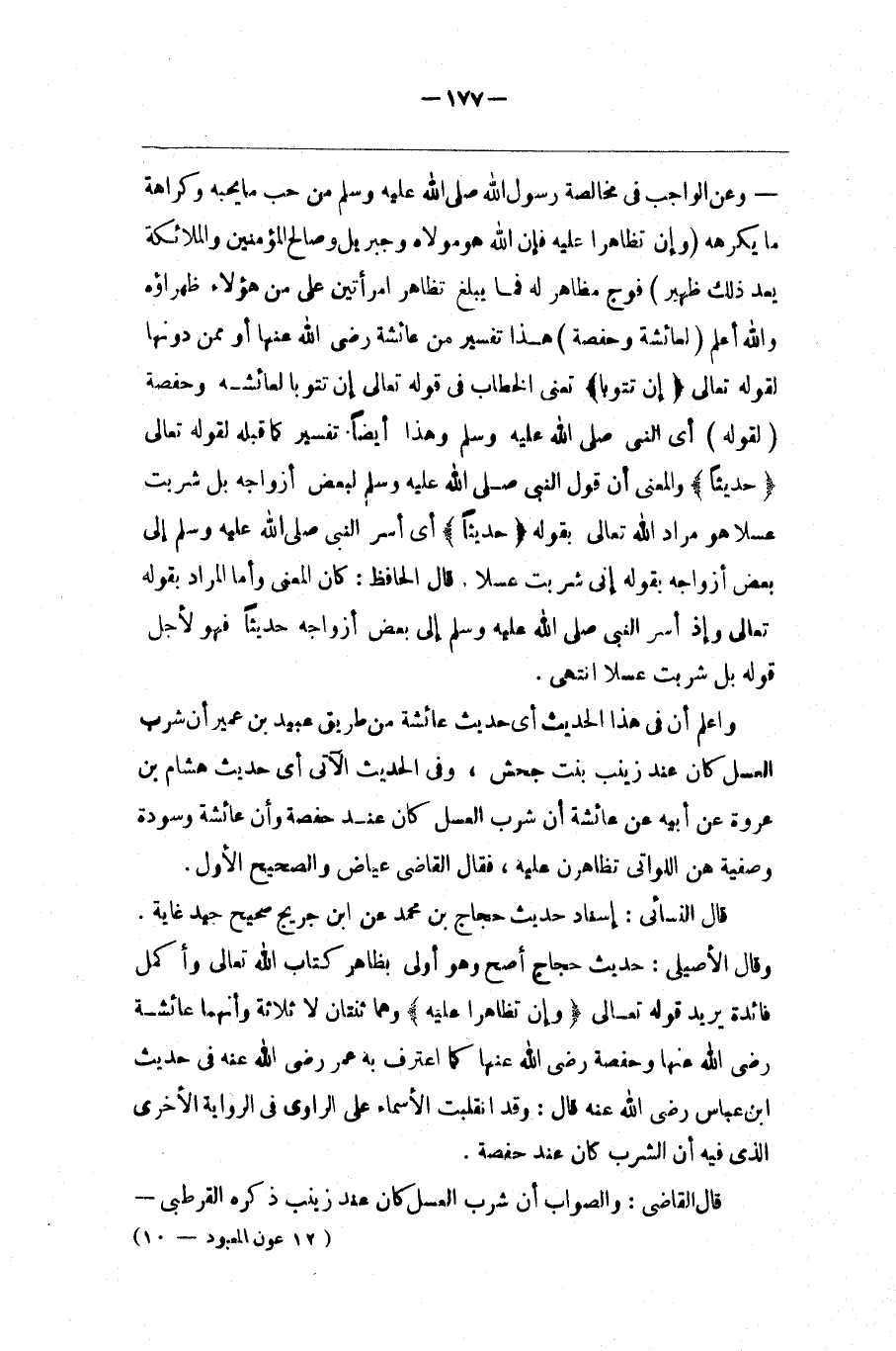 قَالَ النَّسَائِيُّ : إِسْنَاد حَدِيث حَجَّاج بْن مُحَمَّد عَنْ اِبْن جُرَيْجٍ صَحِيح جَيِّد غَايَة . وَقَالَ الْأَصِيلِيّ : حَدِيث حَجَّاج أَصَحُّ وَهُوَ أَوْلَى بِظَاهِرِ كِتَاب اللَّه تَعَالَى وَأَكْمَلُ فَائِدَة يُرِيد قَوْله تَعَالَى { وَإِنْ تَظَاهَرَا عَلَيْهِ } وَهُمَا ثِنْتَانِ لَا ثَلَاثَة وَأَنَّهُمَا عَائِشَة رَضِيَ اللَّه عَنْهَا وَحَفْصَة رَضِيَ اللَّه عَنْهَا كَمَا اِعْتَرَفَ بِهِ عُمَر رَضِيَ اللَّه عَنْهُ فِي حَدِيث اِبْن عَبَّاس رَضِيَ اللَّه عَنْهُ قَالَ : وَقَدْ اِنْقَلَبَتْ الْأَسْمَاء عَلَى الرَّاوِي فِي الرِّوَايَة الْأُخْرَى الَّذِي فِيهِ أَنَّ الشُّرْب كَانَ عِنْد حَفْصَة . قَالَ الْقَاضِي : وَالصَّوَاب أَنَّ شُرْب الْعَسَل كَانَ عِنْد زَيْنَب ذَكَرَهُ الْقُرْطُبِيّ@