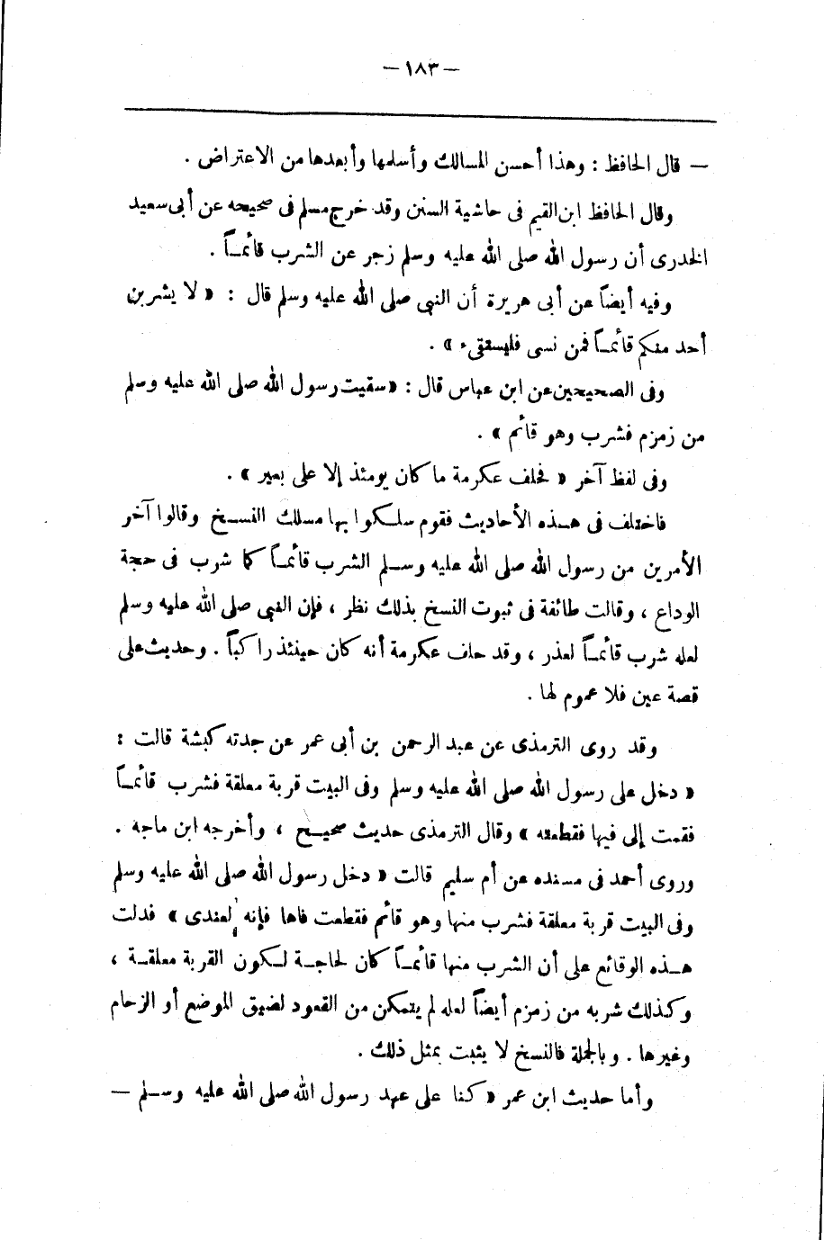 وَقَدْ رَوَى التِّرْمِذِيّ عَنْ عَبْد الرَّحْمَن بْن أَبِي عُمَر عَنْ جَدَّته كَبْشَة قَالَتْ : " دَخَلَ عَلَيَّ رَسُول اللَّه صَلَّى اللَّه عَلَيْهِ وَسَلَّمَ وَفِي الْبَيْت قِرْبَة مُعَلَّقَة فَشَرِبَ قَائِمًا فَقُمْت إِلَى فِيهَا فَقَطَعْته " وَقَالَ التِّرْمِذِيّ حَدِيث صَحِيح ، وَأَخْرَجَهُ اِبْن مَاجَهْ . وَرَوَى أَحْمَد فِي مُسْنَده عَنْ أُمّ سُلَيْمٍ قَالَتْ " دَخَلَ رَسُول اللَّه صَلَّى اللَّه عَلَيْهِ وَسَلَّمَ وَفِي الْبَيْت قِرْبَة مُعَلَّقَةٌ فَشَرِبَ مِنْهَا وَهُوَ قَائِم فَقَطَعْت فَاهَا فَإِنَّهُ لَعِنْدِي " فَدَلَّتْ هَذِهِ الْوَقَائِع عَلَى أَنَّ الشُّرْب مِنْهَا قَائِمًا كَانَ لِحَاجَةٍ لِكَوْنِ الْقِرْبَةِ مُعَلَّقَة ، وَكَذَلِكَ شُرْبه مِنْ زَمْزَم أَيْضًا لَعَلَّهُ لَمْ يَتَمَكَّن مِنْ الْقُعُود لِضِيقِ الْمَوْضِع أَوْ الزِّحَام وَغَيْرهَا . وَالْجُمْلَة فَالنَّسْخ لَا يَثْبُت بِمِثْلِ ذَلِكَ .