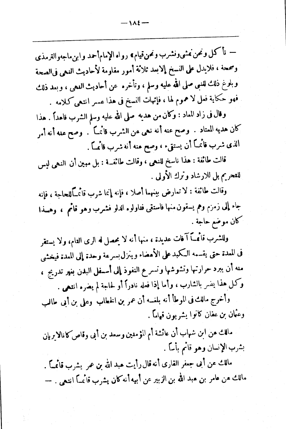 نَأْكُل وَنَحْنُ نَمْشِي وَنَشْرَب وَنَحْنُ قِيَام " رَوَاهُ الْإِمَام أَحْمَد وَابْن مَاجَهْ وَالتِّرْمِذِيّ وَصَحَّحَهُ ، فَلَا يَدُلّ عَلَى النَّسْخ إِلَّا بَعْد ثَلَاثَة أُمُور : مُقَاوَمَتُهُ لِأَحَادِيثِ النَّهْي فِي الصِّحَّة ، وَبُلُوغُ ذَلِكَ لِلنَّبِيِّ صَلَّى اللَّه عَلَيْهِ وَسَلَّمَ ، وَتَأَخُّره عَنْ أَحَادِيث النَّهْي ، وَبَعْد ذَلِكَ فَهُوَ حِكَايَة فِعْل لَا عُمُوم لَهَا ، فَإِثْبَات النَّسْخ فِي هَذَا عُسْر اِنْتَهَى كَلَامه .