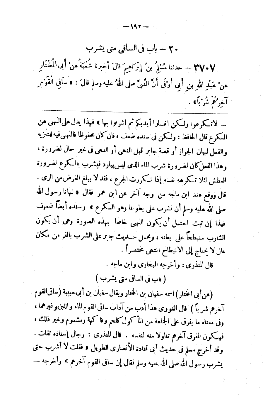 : قَالَ النَّوَوِيّ هَذَا أَدَب مِنْ آدَاب سَاقِي الْقَوْم الْمَاء وَاللَّبَن وَغَيْرهمَا ، وَفِي مَعْنَاهُ مَا يُفَرَّق عَلَى الْجَمَاعَة مِنْ الْمَأْكُول كَلَحْمٍ وَفَاكِهَةٍ وَمَشْمُوم وَغَيْر ذَلِكَ ، فَيَكُون الْمُفَرِّق آخِرهمْ تَنَاوُلًا مِنْهُ لِنَفْسِهِ . قَالَ الْمُنْذِرِيُّ : رِجَال إِسْنَاده ثِقَات . وَقَدْ أَخْرَجَ مُسْلِم فِي حَدِيث أَبِي قَتَادَة الْأَنْصَارِيّ الطَّوِيل " فَقُلْت لَا أَشْرَب حَتَّى يَشْرَب رَسُول اللَّه صَلَّى اللَّه عَلَيْهِ وَسَلَّمَ فَقَالَ إِنَّ سَاقِي الْقَوْم آخِرهمْ " وَأَخْرَجَهُ@