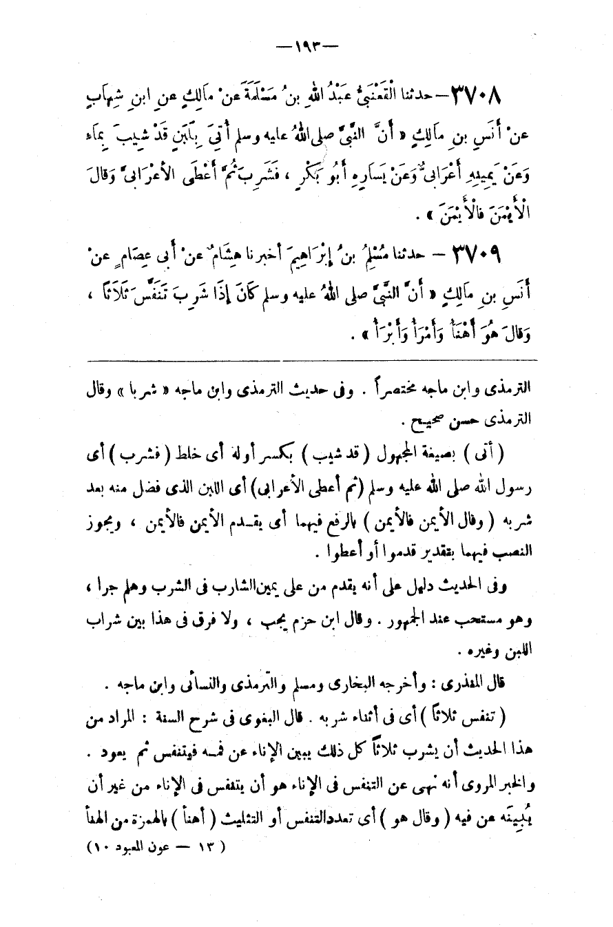 وَفِي الْحَدِيث دَلِيل عَلَى أَنَّهُ يُقَدَّم مَنْ عَلَى يَمِين الشَّارِب فِي الشُّرْب وَهَلُمَّ جَرًّا ، وَهُوَ مُسْتَحَبٌّ عِنْدَ الْجُمْهُورِ . وَقَالَ اِبْن حَزْم يَجِب ، وَلَا فَرْق فِي هَذَا بَيْن شَرَاب اللَّبَن وَغَيْره .