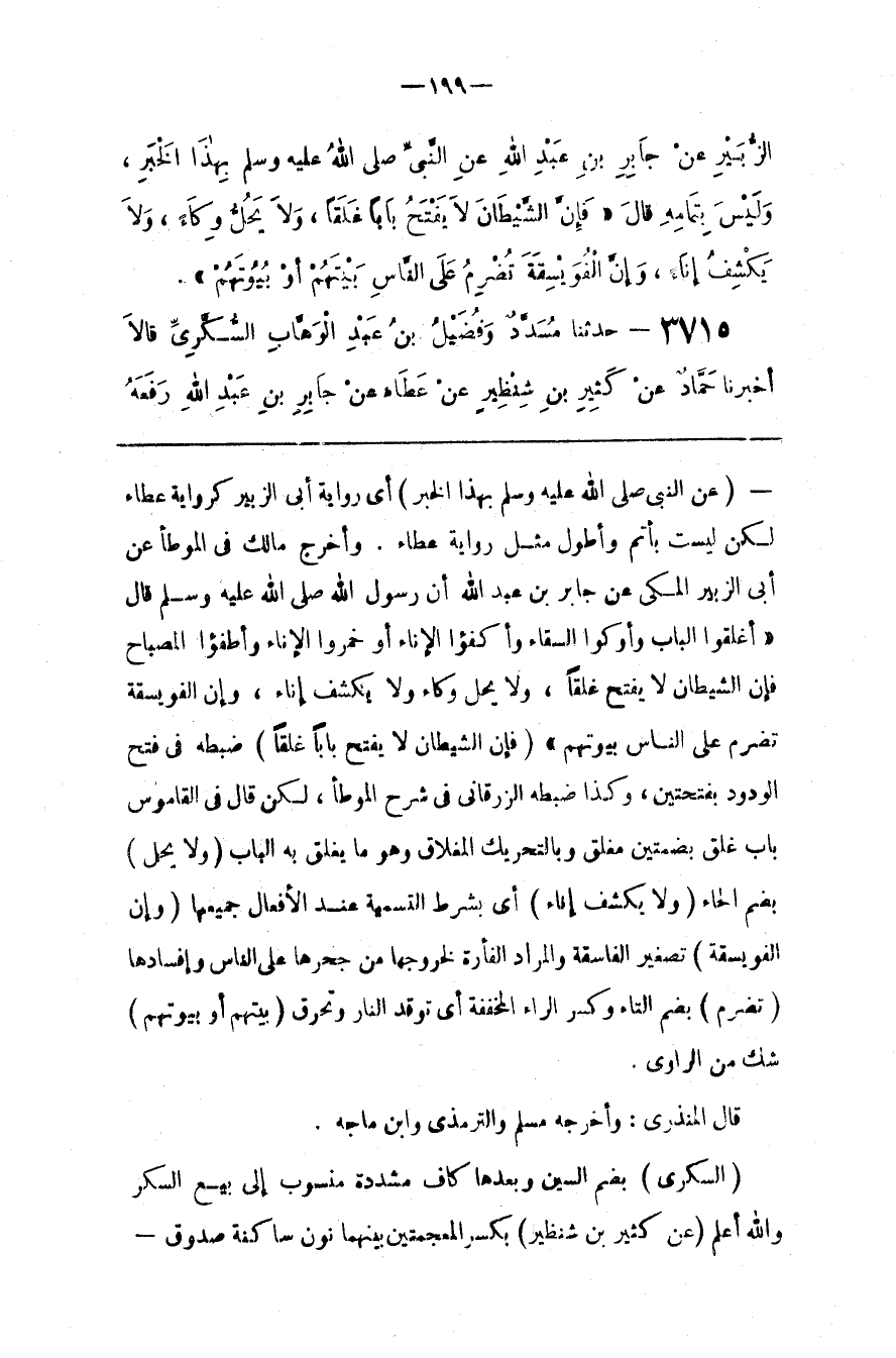 : أَيْ رِوَايَة أَبِي الزُّبَيْر كَرِوَايَةِ عَطَاء لَكِنْ لَيْسَتْ بِأَتَمَّ وَأَطْوَلَ مِثْل رِوَايَة عَطَاء . وَأَخْرَجَ مَالِك فِي الْمُوَطَّأ عَنْ أَبِي الزُّبَيْر الْمَكِّيّ عَنْ جَابِر بْن عَبْد اللَّه أَنَّ رَسُول اللَّه صَلَّى اللَّه عَلَيْهِ وَسَلَّمَ قَالَ " أَغْلِقُوا الْبَاب وَأَوْكُوا السِّقَاء وَأَكْفِئُوا الْإِنَاءَ أَوْ خَمِّرُوا الْإِنَاء وَأَطْفِئُوا الْمِصْبَاح فَإِنَّ الشَّيْطَان لَا يَفْتَح غَلَقًا ، وَلَا يَحِلّ وِكَاء وَلَا يَكْشِف إِنَاء ، وَإِنَّ الْفُوَيْسِقَةَ تُضْرِم عَلَى النَّاس بُيُوتهمْ "