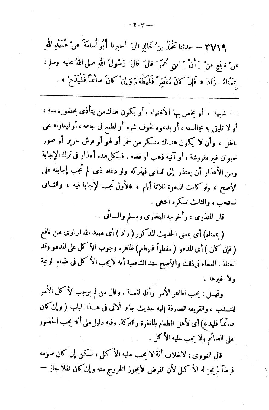 : ظَاهِره وُجُوب الْأَكْل عَلَى الْمَدْعُوّ وَقَدْ اِخْتَلَفَ الْعُلَمَاء فِي ذَلِكَ وَالْأَصَحّ عِنْد الشَّافِعِيَّة أَنَّهُ لَا يَجِب الْأَكْل فِي طَعَام الْوَلِيمَة وَلَا غَيْرهَا .