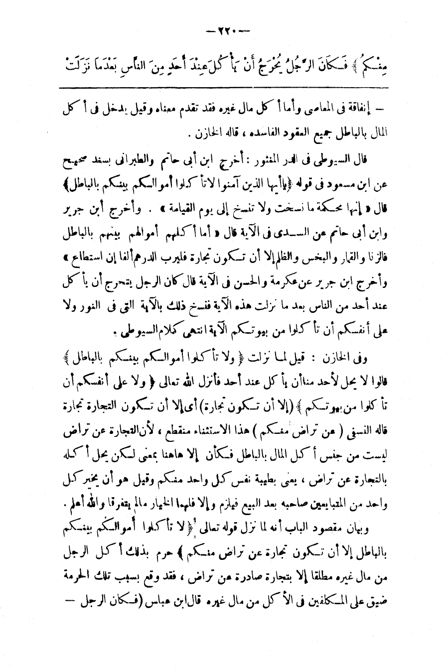 قَالَ السُّيُوطِيُّ فِي الدُّرّ الْمَنْثُور : أَخْرَجَ اِبْن أَبِي حَاتِم وَالطَّبَرَانِيُّ بِسَنَدٍ صَحِيحٍ عَنْ اِبْن مَسْعُود فِي قَوْله { يَا أَيُّهَا الَّذِينَ آمَنُوا لَا تَأْكُلُوا أَمْوَالَكُمْ بَيْنَكُمْ بِالْبَاطِلِ } قَالَ " إِنَّهَا مُحْكَمَة مَا نُسِخَتْ وَلَا تُنْسَخ إِلَى يَوْم الْقِيَامَة " . وَأَخْرَجَ اِبْن جَرِير وَابْن حَاتِم عَنْ السُّدِّيّ فِي الْآيَة قَالَ " أَمَّا أَكْلهمْ أَمْوَالهمْ بَيْنَهُمْ بِالْبَاطِلِ فَالزِّنَا وَالْقِمَار وَالْبَخْس وَالظُّلْم إِلَّا أَنْ تَكُون تِجَارَة فَلْيُرَبِّ الدِّرْهَمَ أَلْفًا إِنْ اِسْتَطَاعَ " وَأَخْرَجَ اِبْن جَرِير عَنْ عِكْرِمَة وَالْحَسَن فِي الْآيَة قَالَ كَانَ الرَّجُل يَتَحَرَّج أَنْ يَأْكُلَ عِنْد أَحَد مِنْ النَّاس بَعْدَمَا نَزَلَتْ هَذِهِ الْآيَة فَنُسِخَ ذَلِكَ بِالْآيَةِ الَّتِي فِي النُّور { وَلَا عَلَى أَنْفُسِكُمْ أَنْ تَأْكُلُوا مِنْ بُيُوتِكُمْ } الْآيَة اِنْتَهَى كَلَام السُّيُوطِيّ .
