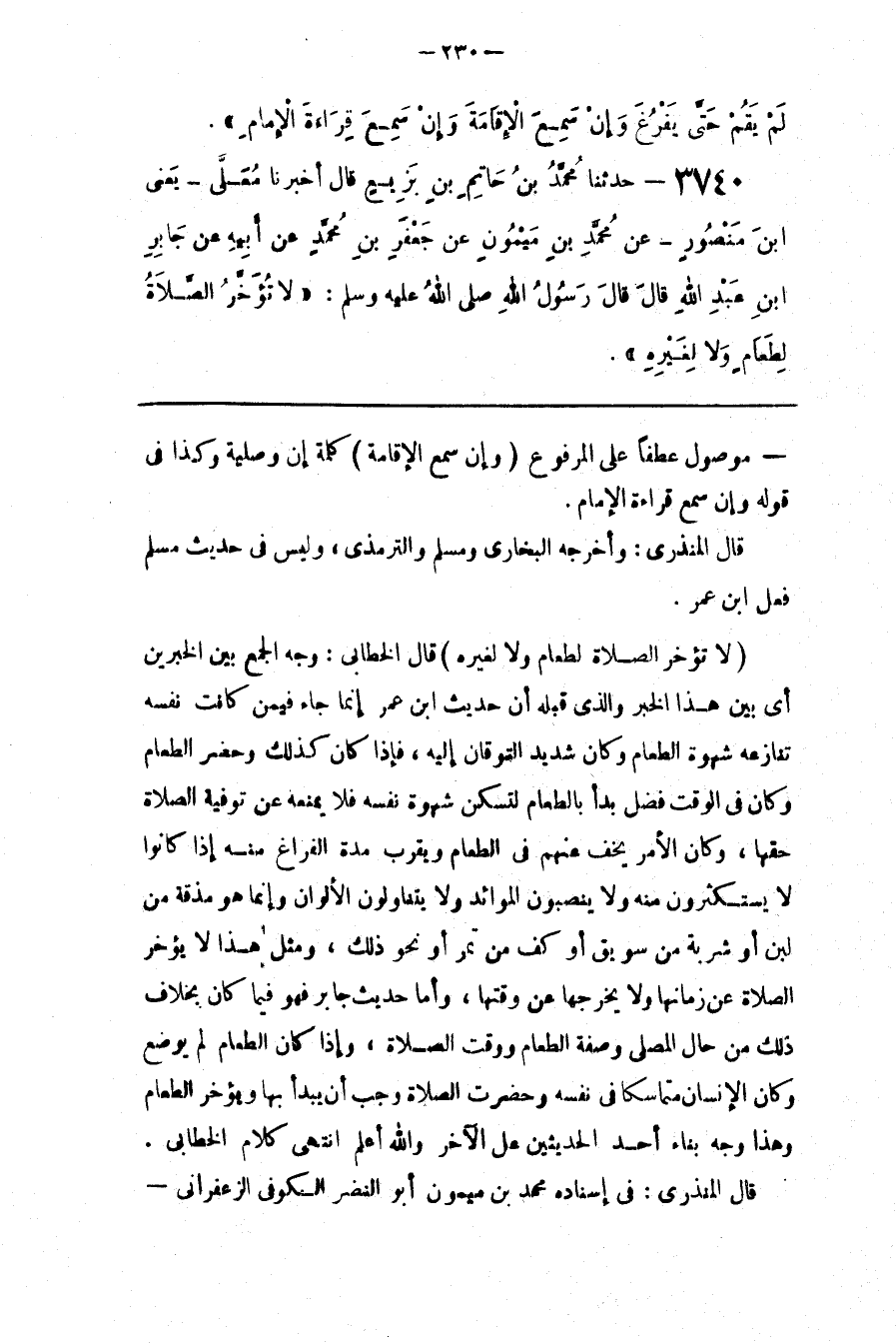 ( لَا تُؤَخَّر الصَّلَاة لِطَعَامٍ وَلَا لِغَيْرِهِ )