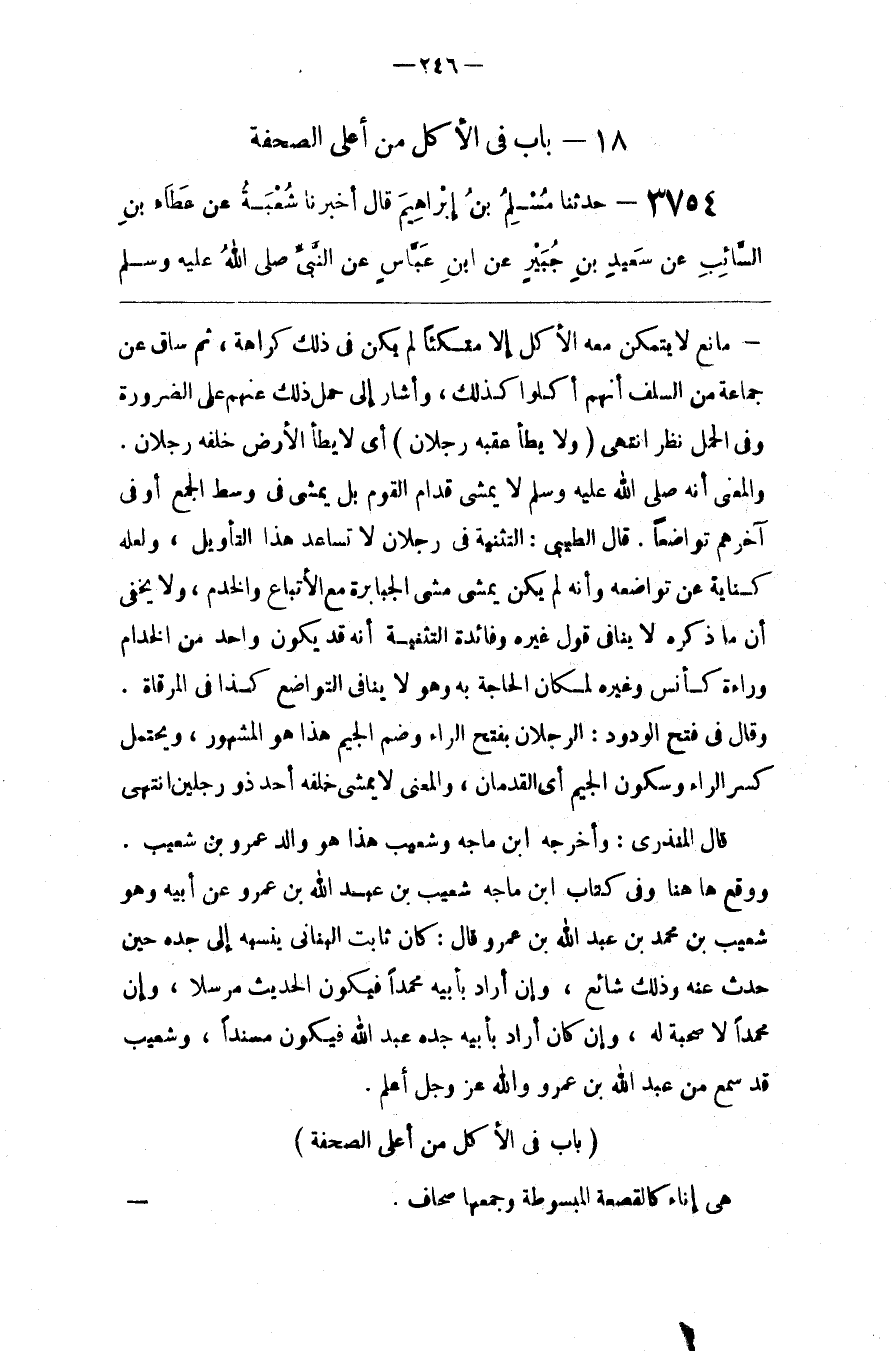 قَالَ الْمُنْذِرِيُّ : وَأَخْرَجَهُ اِبْن مَاجَهْ وَشُعَيْب هَذَا هُوَ وَالِد عَمْرو بْن شُعَيْب . وَوَقَعَ هَا هُنَا وَفِي كِتَاب اِبْن مَاجَهْ شُعَيْب بْن عَبْد اللَّه بْن عَمْرو عَنْ أَبِيهِ وَهُوَ شُعَيْب بْن مُحَمَّد بْن عَبْد اللَّه بْن عَمْرو قَالَ : كَانَ ثَابِت الْبُنَانِيّ يَنْسُبهُ إِلَى جَدّه حِين حَدَّثَ عَنْهُ وَذَلِكَ شَائِع ، وَإِنْ كَانَ أَرَادَ بِأَبِيهِ مُحَمَّدًا فَيَكُون الْحَدِيث مُرْسَلًا ، وَإِنَّ مُحَمَّدًا لَا صُحْبَةَ لَهُ وَإِنْ كَانَ أَرَادَ جَدّه عَبْد اللَّه فَيَكُون مُسْنَدًا ، وَشُعَيْب قَدْ سَمِعَ مِنْ عَبْد اللَّه بْن عَمْرو وَاَللَّه عَزَّ وَجَلَّ أَعْلَمُ .