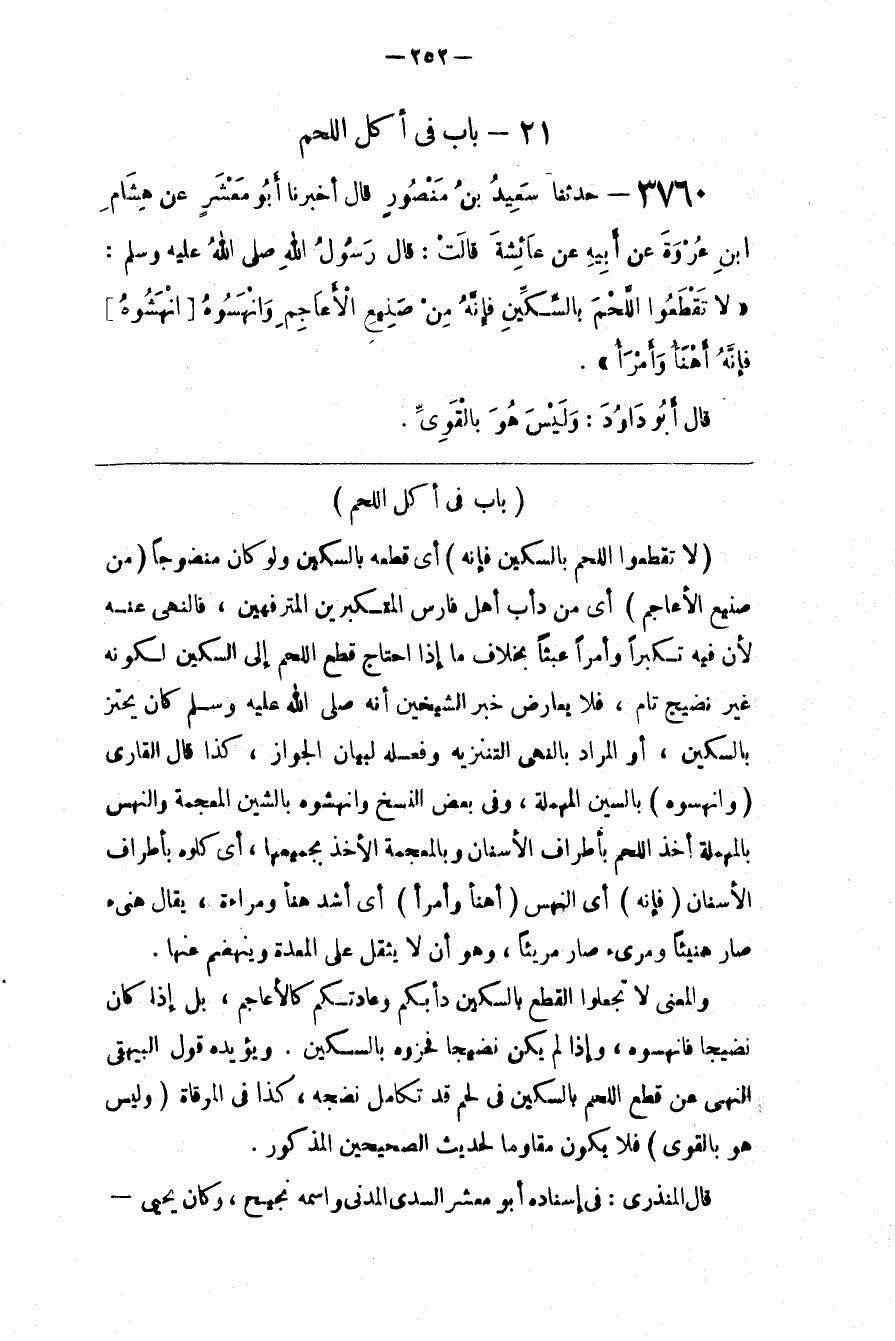 وَالْمَعْنَى لَا تَجْعَلُوا الْقَطْع بِالسِّكِّينِ دَأْبكُمْ وَعَادَتكُمْ كَالْأَعَاجِمِ ، بَلْ إِذَا كَانَ نَضِيجًا فَانْهَسُوهُ ، وَإِذَا لَمْ يَكُنْ نَضِيجًا فَحُزُّوهُ بِالسِّكِّينِ . وَيُؤَيِّدهُ قَوْل الْبَيْهَقِيِّ النَّهْي عَنْ قَطْع اللَّحْم بِالسِّكِّينِ فِي لَحْم قَدْ تَكَامَلَ نُضْجه ، كَذَا فِي الْمِرْقَاة