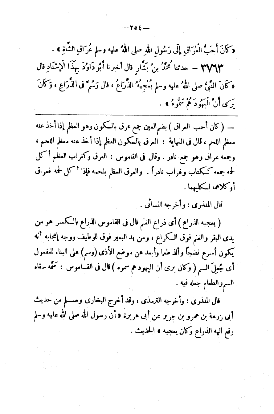قَالَ الْمُنْذِرِيُّ : وَأَخْرَجَهُ التِّرْمِذِيّ ، وَقَدْ أَخْرَجَ الْبُخَارِيّ وَمُسْلِم مِنْ حَدِيث أَبِي زُرْعَة بْن عَمْرو بْن جَرِير عَنْ أَبِي هُرَيْرَة " أَنَّ رَسُول اللَّه صَلَّى اللَّه عَلَيْهِ وَسَلَّمَ رُفِعَ إِلَيْهِ الذِّرَاع وَكَانَ يُعْجِبهُ " الْحَدِيث .@