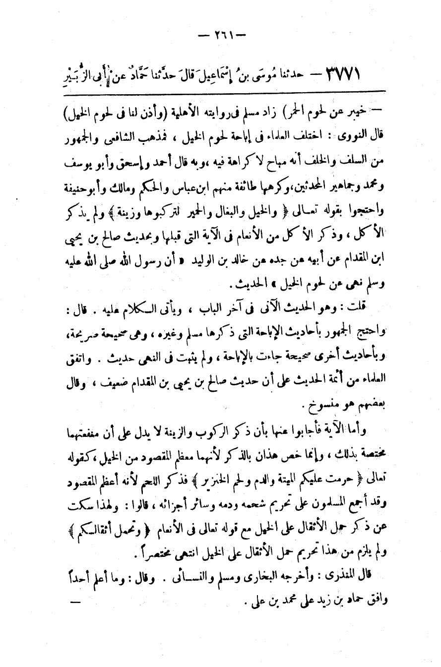 وَأَمَّا الْآيَة فَأَجَابُوا عَنْهَا بِأَنَّ ذِكْر الرُّكُوب وَالزِّينَة لَا يَدُلّ عَلَى أَنَّ مَنْفَعَتهمَا مُخْتَصَّة بِذَلِكَ ، وَإِنَّمَا خُصَّ هَذَانِ بِالذِّكْرِ لِأَنَّهُمَا مُعْظَم الْمَقْصُود مِنْ الْخَيْل ، كَقَوْلِهِ تَعَالَى { حُرِّمَتْ عَلَيْكُمْ الْمَيْتَةُ وَالدَّمُ وَلَحْمُ الْخِنْزِيرِ } فَذَكَرَ اللَّحْمَ لِأَنَّهُ أَعْظَمُ الْمَقْصُود وَقَدْ أَجْمَعَ الْمُسْلِمُونَ عَلَى تَحْرِيم شَحْمه وَدَمه وَسَائِر أَجْزَائِهِ ، قَالُوا : وَلِهَذَا سَكَتَ عَنْ ذِكْر حَمْل الْأَثْقَال عَلَى الْخَيْل مَعَ قَوْله تَعَالَى فِي الْإِنْعَام { وَتَحْمِلُ أَثْقَالَكُمْ } وَلَمْ يَلْزَم مِنْ هَذَا تَحْرِيم حَمْل الْأَثْقَال عَلَى الْخَيْل اِنْتَهَى مُخْتَصَرًا . قَالَ الْمُنْذِرِيُّ : وَأَخْرَجَهُ الْبُخَارِيّ وَمُسْلِم وَالنَّسَائِيُّ . وَقَالَ : وَمَا أَعْلَمُ أَحَدًا وَافَقَ حَمَّاد بْن زَيْد عَلَى مُحَمَّدِ بْنِ عَلِيٍّ .@