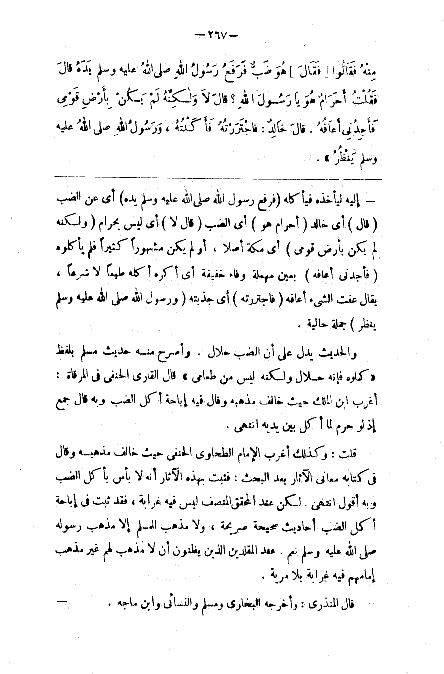 قُلْت : وَكَذَلِكَ أَغْرَبَ الْإِمَام الطَّحَاوِيُّ الْحَنَفِيّ حَيْثُ خَالَفَ مَذْهَبه وَقَالَ فِي كِتَابه مَعَانِي الْآثَار بَعْد الْبَحْث : فَثَبَتَ بِهَذِهِ الْآثَار أَنَّهُ لَا بَأْس بِأَكْلِ الضَّبّ وَبِهِ أَقُول اِنْتَهَى . لَكِنْ عِنْد الْمُحَقِّق الْمُنْصِف لَيْسَ فِيهِ غَرَابَة ، فَقَدْ ثَبَتَ فِي إِبَاحَة أَكْل الضَّبّ أَحَادِيث صَحِيحَة صَرِيحَة ، وَلَا مَذْهَب لِلْمُسْلِمِ إِلَّا مَذْهَب رَسُوله صَلَّى اللَّه عَلَيْهِ وَسَلَّمَ نَعَمْ عِنْد الْمُقَلِّدِينَ الَّذِينَ يَظُنُّونَ أَنْ لَا مَذْهَبَ لَهُمْ غَيْر مَذْهَب إِمَامهمْ فِيهِ غَرَابَة بِلَا مِرْيَةٍ .