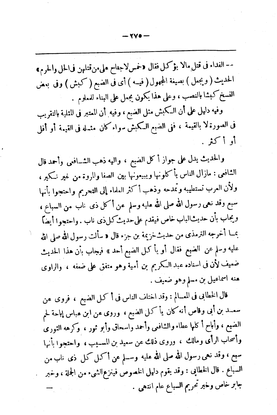 قَالَ الْخَطَّابِيُّ فِي الْمَعَالِم : وَقَدْ اِخْتَلَفَ النَّاس فِي أَكْل الضَّبُع ، فَرُوِيَ عَنْ سَعْد بْن أَبِي وَقَّاص أَنَّهُ كَانَ يَأْكُل الضَّبُع ، وَرُوِيَ عَنْ اِبْن عَبَّاس إِبَاحَة لَحْم الضَّبُع ، وَأَبَاحَ أَكْلهَا عَطَاء وَالشَّافِعِيّ وَأَحْمَد وَإِسْحَاق وَأَبُو ثَوْر ، وَكَرِهَهُ الثَّوْرِيّ وَأَصْحَاب الرَّأْي وَمَالِك ، وَرُوِيَ ذَلِكَ عَنْ سَعِيد بْن الْمُسَيِّب ، وَاحْتَجُّوا بِأَنَّهَا سَبُع ، وَقَدْ نَهَى رَسُول اللَّه صَلَّى اللَّه عَلَيْهِ وَسَلَّمَ عَنْ أَكْل كُلّ ذِي نَابٍ مِنْ السِّبَاع . قَالَ الْخَطَّابِيُّ : وَقَدْ يَقُوم دَلِيل الْخُصُوص فَيُنْزَع الشَّيْء مِنْ الْجُمْلَة ، وَخَبَر جَابِر خَاصّ وَخَبَر تَحْرِيم السِّبَاع عَامّ اِنْتَهَى .@