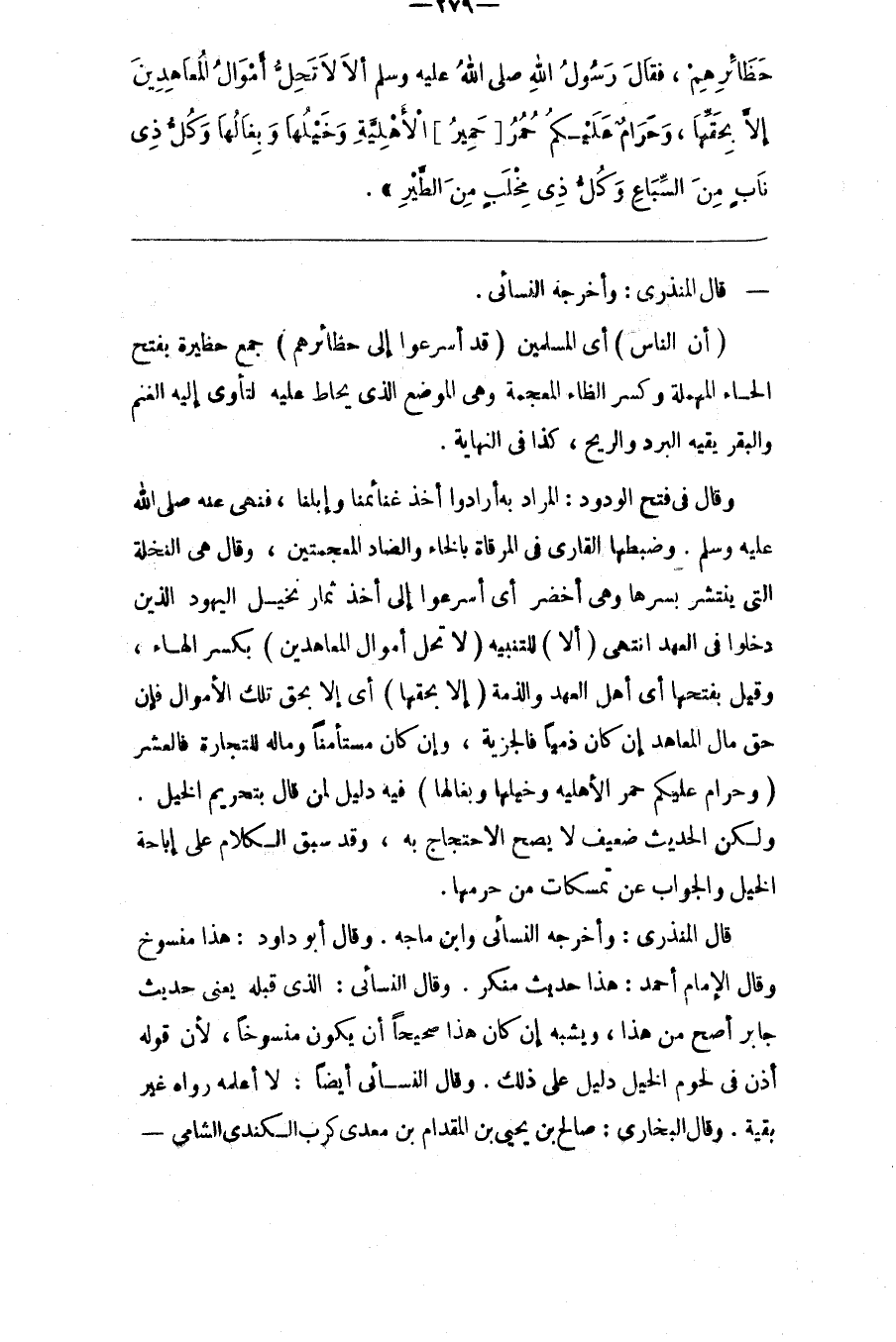 قَالَ الْمُنْذِرِيُّ : وَأَخْرَجَهُ النَّسَائِيُّ وَابْن مَاجَهْ . وَقَالَ أَبُو دَاوُدَ : هَذَا مَنْسُوخ وَقَالَ الْإِمَام أَحْمَد : هَذَا حَدِيث مُنْكَر . وَقَالَ النَّسَائِيُّ : الَّذِي قَبْله يَعْنِي حَدِيث جَابِر أَصَحّ مِنْ هَذَا ، وَيُشْبِه إِنْ كَانَ هَذَا صَحِيحًا أَنْ يَكُونَ مَنْسُوخًا ، لِأَنَّ قَوْلَهُ أُذِنَ فِي لُحُوم الْخَيْل دَلِيل عَلَى ذَلِكَ . وَقَالَ النَّسَائِيُّ أَيْضًا : لَا أَعْلَمهُ رَوَاهُ غَيْرُ بَقِيَّةَ . وَقَالَ الْبُخَارِيّ : صَالِح بْن يَحْيَى بْن الْمِقْدَام بْن مَعْدِي كَرِبَ الْكِنْدِيّ الشَّامِيّ@