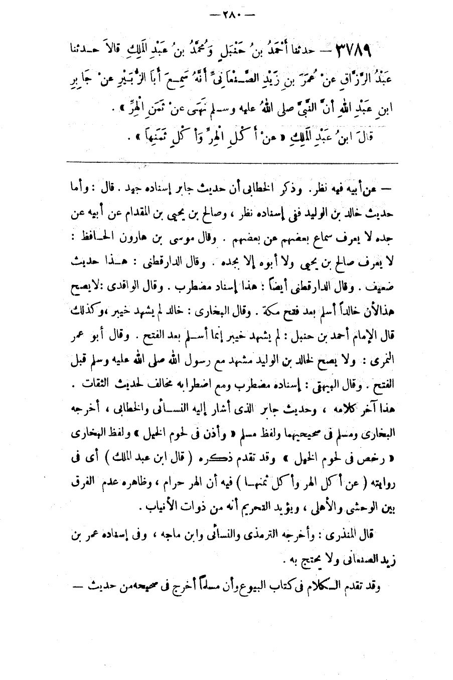 قَالَ : وَأَمَّا حَدِيث خَالِد بْن الْوَلِيد فَفِي إِسْنَاده نَظَر ، وَصَالِح بْن يَحْيَى بْن الْمِقْدَام عَنْ أَبِيهِ عَنْ جَدّه لَا يُعْرَف سَمَاعُ بَعْضهمْ عَنْ بَعْضهمْ . وَقَالَ مُوسَى بْن هَارُون الْحَافِظ : لَا يُعْرَف صَالِح بْن يَحْيَى وَلَا أَبُوهُ إِلَّا بِجَدِّهِ . وَقَالَ الدَّارَقُطْنِيُّ : هَذَا حَدِيث ضَعِيف . وَقَالَ الدَّارَقُطْنِيُّ أَيْضًا : هَذَا إِسْنَاد مُضْطَرِب . وَقَالَ الْوَاقِدِيّ : لَا يَصِحّ هَذَا لِأَنَّ خَالِدًا أَسْلَمَ بَعْد فَتْح مَكَّة . وَقَالَ الْبُخَارِيّ : خَالِد لَمْ يَشْهَد خَيْبَر ، وَكَذَلِكَ قَالَ الْإِمَام أَحْمَد بْن حَنْبَل : لَمْ يَشْهَد خَيْبَر إِنَّمَا أَسْلَمَ بَعْد الْفَتْح . وَقَالَ أَبُو عُمَر النَّمَرِيّ : وَلَا يَصِحّ لِخَالِدِ بْن الْوَلِيد مَشْهَد مَعَ رَسُول اللَّه صَلَّى اللَّه عَلَيْهِ وَسَلَّمَ قَبْل الْفَتْح . وَقَالَ الْبَيْهَقِيُّ : إِسْنَاده مُضْطَرِب وَمَعَ اِضْطِرَابه مُخَالِف لِحَدِيثِ الثِّقَات . هَذَا آخِر كَلَامه ، وَحَدِيث جَابِر الَّذِي أَشَارَ إِلَيْهِ النَّسَائِيُّ وَالْخَطَّابِيّ ، أَخْرَجَهُ الْبُخَارِيّ وَمُسْلِم فِي صَحِيحَيْهِمَا وَلَفْظ مُسْلِم " وَأَذِنَ فِي لُحُوم الْخَيْل " وَلَفْظ الْبُخَارِيّ " رَخَّصَ فِي لُحُوم الْخَيْل " وَقَدْ تَقَدَّمَ ذِكْره .