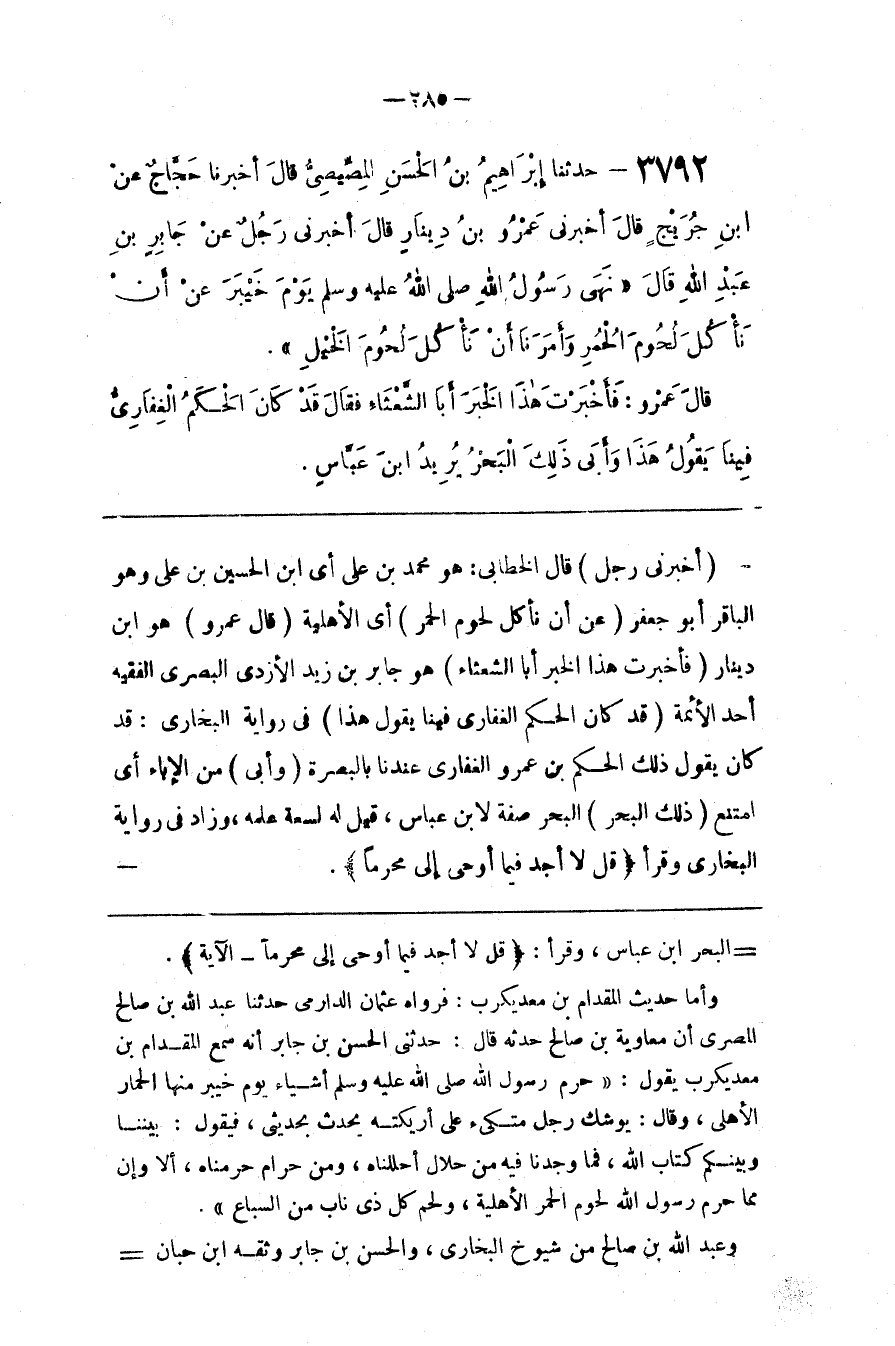 وأما حديث المقدام بن معد يكرب فرواه عثمان الدارمي حدثنا عبد الله بن صالح المصري أن معاوية بن صالح حدثه قال حدثني الحسن بن جابر أنه سمع المقدام بن معد يكرب يقول حرم رسول الله صلى الله عليه و سلم أشياء يوم خيبر منها الحمار الأهلي وقال يوشك رجل متكىء على أريكته يحدث بحديثي فيقول بيننا وبينكم كتاب الله فما وجدنا فيه من حلال أحللناه ومن حرام حرمناه ألا وإن مما حرم رسول الله لحوم الحمر الأهلية ولحم كل ذي ناب من السباع