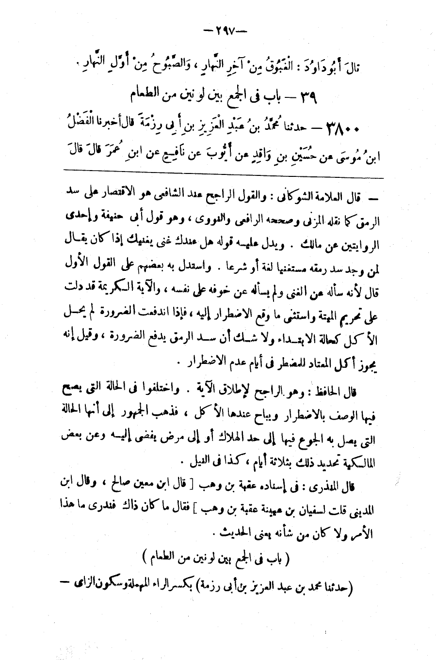 قَالَ الْحَافِظ : وَهُوَ الرَّاجِح لِإِطْلَاقِ الْآيَة . وَاخْتَلَفُوا فِي الْحَالَة الَّتِي يَصِحّ فِيهَا الْوَصْف بِالِاضْطِرَارِ وَيُبَاح عِنْدهَا الْأَكْل فَذَهَبَ الْجُمْهُور إِلَى أَنَّهَا الْحَالَة الَّتِي يَصِلُ بِهِ الْجُوع فِيهَا إِلَى حَدّ الْهَلَاك أَوْ إِلَى مَرَض يُفْضِي إِلَيْهِ وَعَنْ بَعْض الْمَالِكِيَّة تَحْدِيد ذَلِكَ بِثَلَاثَةِ أَيَّام ، كَذَا فِي النَّيْل . قَالَ الْمُنْذِرِيُّ : فِي إِسْنَاده عُقْبَة بْن وَهْب قَالَ اِبْن مَعِين صَالِح ، وَقَالَ اِبْن الْمَدِينِيّ قُلْت لِسُفْيَان بْن عُيَيْنَةَ عُقْبَةُ بْن وَهْب فَقَالَ مَا كَانَ ذَاكَ فَنَدْرِي مَا هَذَا الْأَمْر وَلَا كَانَ مِنْ شَأْنه يَعْنِي الْحَدِيث .
