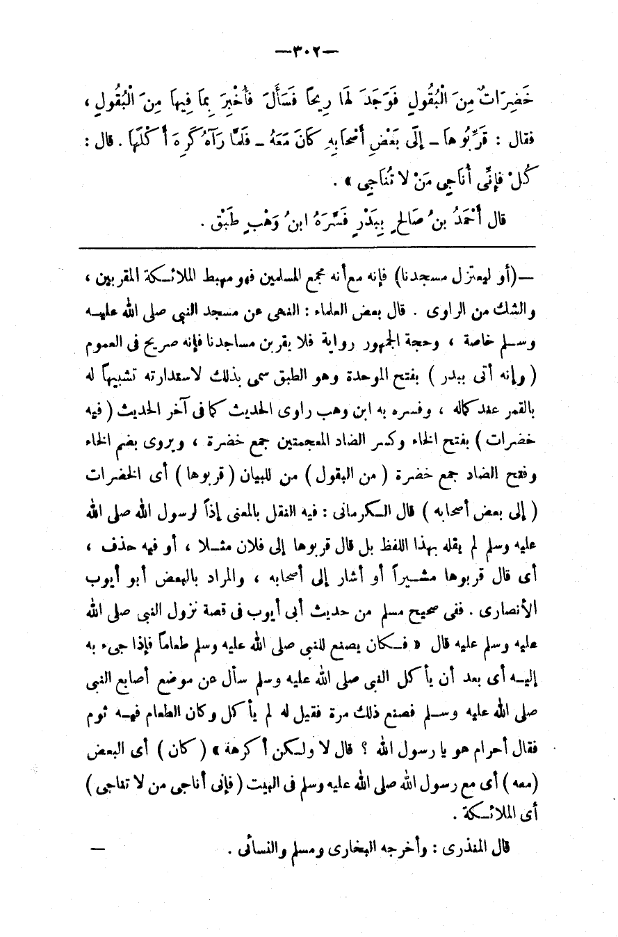 : فَإِنَّهُ مَعَ أَنَّهُ مَجْمَع الْمُسْلِمِينَ فَهُوَ مَهْبِط الْمَلَائِكَة الْمُقَرَّبِينَ وَالشَّكّ مِنْ الرَّاوِي . قَالَ بَعْض الْعُلَمَاء : النَّهْي عَنْ مَسْجِد النَّبِيّ صَلَّى اللَّه عَلَيْهِ وَسَلَّمَ خَاصَّة ، وَحُجَّة الْجُمْهُور رِوَايَةُ فَلَا يَقْرَبَنَّ مَسَاجِدَنَا فَإِنَّهُ صَرِيح فِي الْعُمُوم