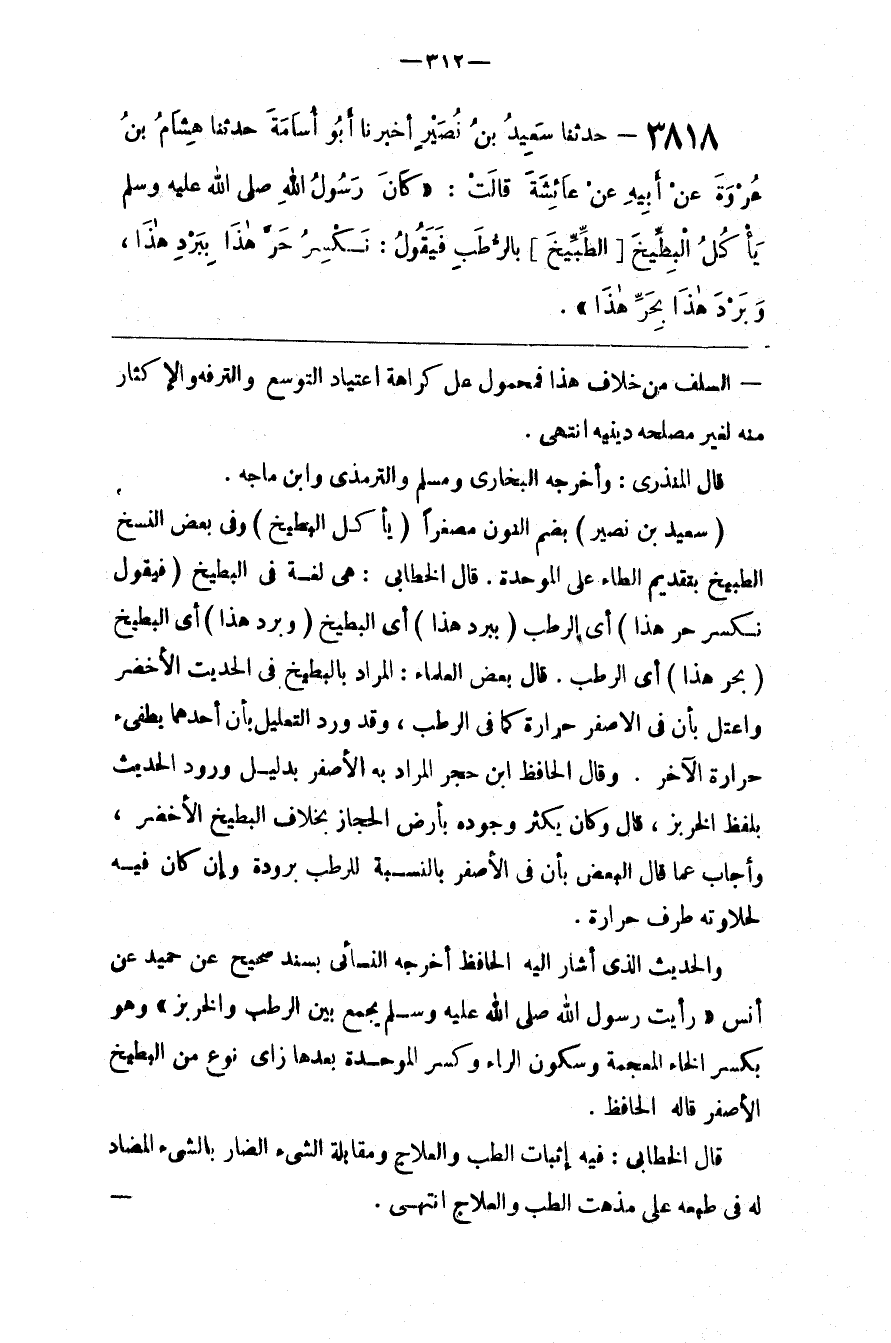 وَالْحَدِيث الَّذِي أَشَارَ إِلَيْهِ الْحَافِظ أَخْرَجَهُ النَّسَائِيُّ بِسَنَدٍ صَحِيح عَنْ حُمَيْدٍ عَنْ أَنَسٍ " رَأَيْت رَسُول اللَّه صَلَّى اللَّه عَلَيْهِ وَسَلَّمَ يَجْمَع بَيْن الرُّطَب وَالْخِرْبِز " وَهُوَ بِكَسْرِ الْخَاء الْمُعْجَمَة وَسُكُون الرَّاء وَكَسْر الْمُوَحَّدَة بَعْدهَا زَايٌ نَوْع مِنْ الْبِطِّيخ الْأَصْفَر قَالَهُ الْحَافِظ .