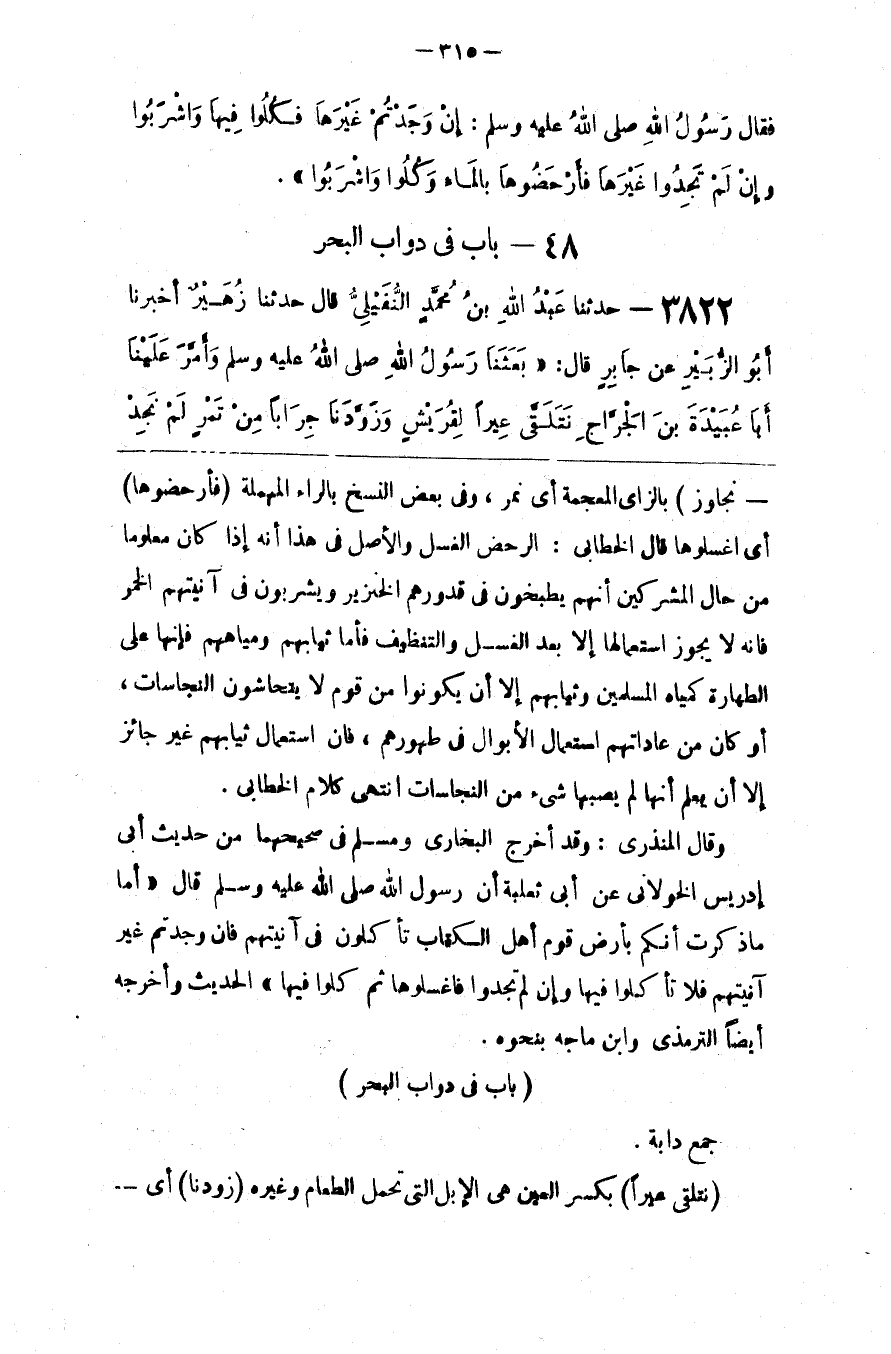 وَقَالَ الْمُنْذِرِيِّ : وَقَدْ أَخْرَجَ الْبُخَارِيّ وَمُسْلِم فِي صَحِيحِهِمَا مِنْ حَدِيث أَبِي إِدْرِيس الْخَوْلَانِيِّ عَنْ أَبِي ثَعْلَبَة أَنَّ رَسُول اللَّه صَلَّى اللَّه عَلَيْهِ وَسَلَّمَ قَالَ " أَمَّا مَا ذَكَرْت أَنَّكُمْ بِأَرْضِ قَوْم أَهْل الْكِتَاب تَأْكُلُونَ فِي آنِيَتهمْ فَإِنْ وَجَدْتُمْ غَيْر آنِيَتهمْ فَلَا تَأْكُلُوا فِيهَا وَإِنْ لَمْ تَجِدُوا فَاغْسِلُوهَا ثُمَّ كُلُوا فِيهَا " الْحَدِيث وَأَخْرَجَهُ أَيْضًا التِّرْمِذِيّ وَابْن مَاجَهْ بِنَحْوِهِ .