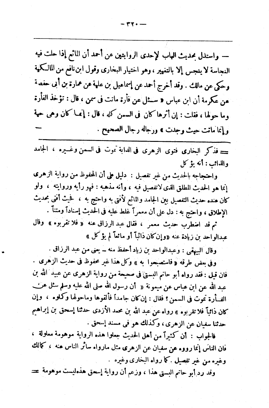 ثم قد اضطرب حديث معمر فقال عبد الرزاق عنه فلا تقربوه وقال عبدالواحد بن زيادة عنه وإن كان ذائبا أو مائعا لم يؤكل وقال البيهقي وعبدالواحد بن زياد أحفظ منه يعني من عبدالرزاق