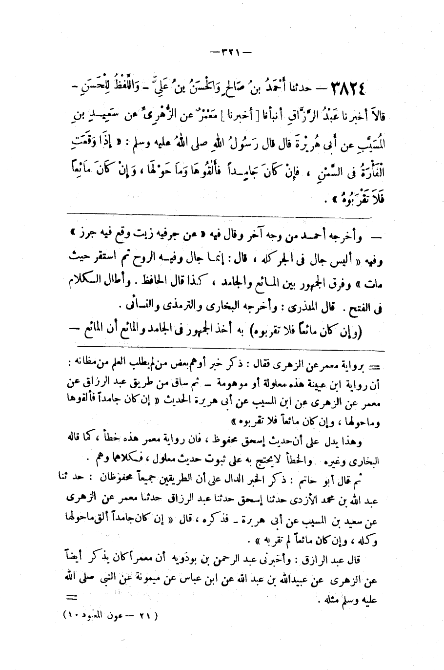 ثم قال أبو حاتم ذكر الخبر الدال على أن الطريقين جميعا محفوظان حدثنا عبد الله بن محمد الأزدي حدثنا إسحاق حدثنا عبدالرزاق حدثنا معمر عن الزهري عن سعيد بن المسيب عن أبي هريرة فذكره قال إن كان جامدا ألق ما حولها وكله وإن كان مائعا لم تقربه