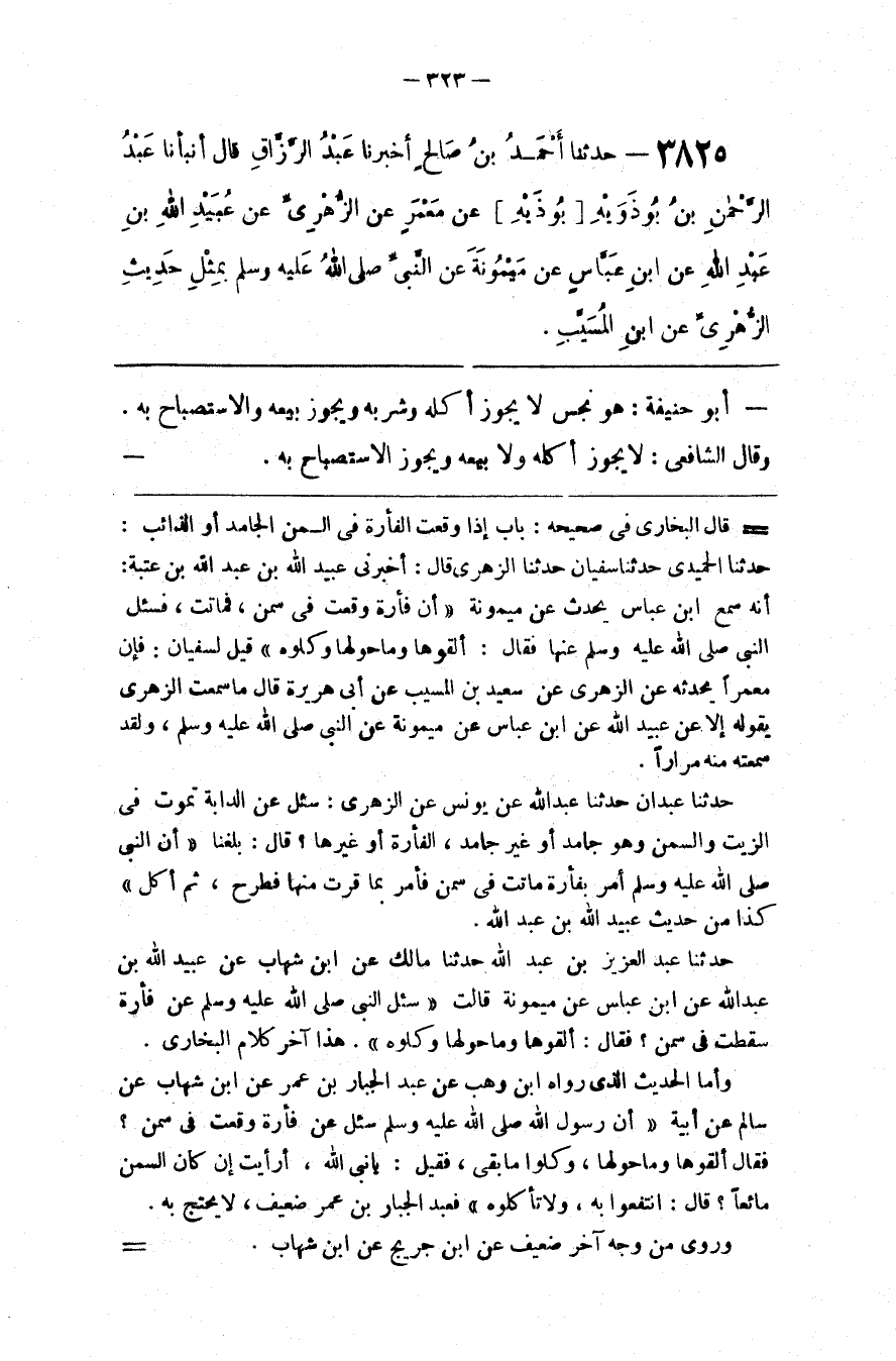 حدثنا عبدان حدثنا عبد الله عن يونس عن الزهري سئل عن الدابة تموت في الزيت والسمن وهو جامد أو غير جامد الفأرة أو غيرها قال بلغنا أن النبي صلى الله عليه و سلم أمر بفأرة ماتت في سمن فأمر بما قرب منها فطرح ثم أكل كذا من حديث عبيد الله بن عبد الله