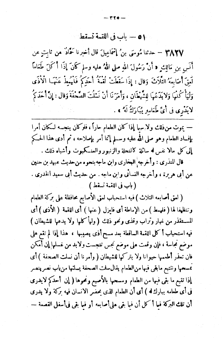 : فِيهِ اِسْتِحْبَاب أَكْل اللُّقْمَة السَّاقِطَة بَعْد مَسْح أَذًى يُصِيبهَا ، هَذَا إِذَا لَمْ تَقَع عَلَى مَوْضِع نَجَاسَة ، فَإِنْ وَقَعَتْ عَلَى مَوْضِع نَجِسٍ تَنَجَّسَتْ وَلَا بُدّ مِنْ غَسْلهَا إِنْ أَمْكَنَ فَإِنْ تَعَذَّرَ أَطْعَمَهَا حَيَوَانًا وَلَا يَتْرُكهَا لِشَيْطَانٍ
