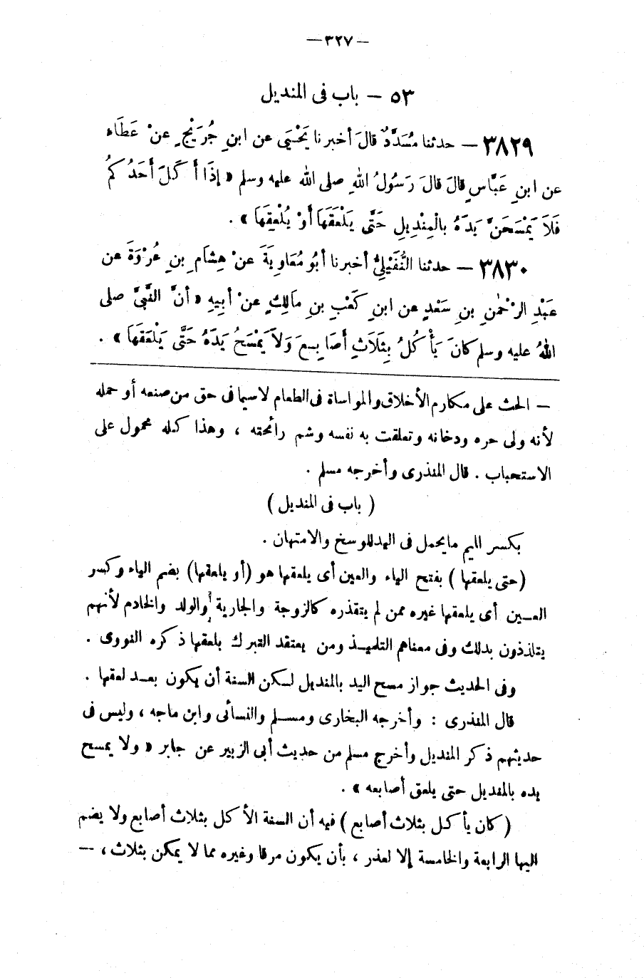 قَالَ الْمُنْذِرِيُّ : وَأَخْرَجَهُ الْبُخَارِيّ وَمُسْلِم وَالنَّسَائِيُّ وَابْن مَاجَهْ ، وَلَيْسَ فِي حَدِيثهمْ ذِكْر الْمِنْدِيل وَأَخْرَجَ مُسْلِم مِنْ حَدِيث أَبِي الزُّبَيْر عَنْ جَابِر " وَلَا يَمْسَح يَده بِالْمِنْدِيلِ حَتَّى يَلْعَق أَصَابِعه " .