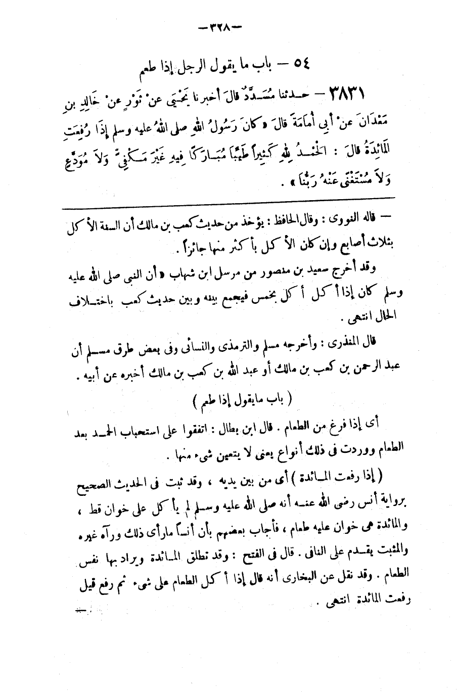 ، قَالَهُ النَّوَوِيّ : وَقَالَ الْحَافِظ : يُؤْخَذ مِنْ حَدِيث كَعْب بْن مَالِك أَنَّ السُّنَّة الْأَكْل بِثَلَاثَةِ أَصَابِع وَإِنْ كَانَ الْأَكْل بِأَكْثَر مِنْهَا جَائِزًا .