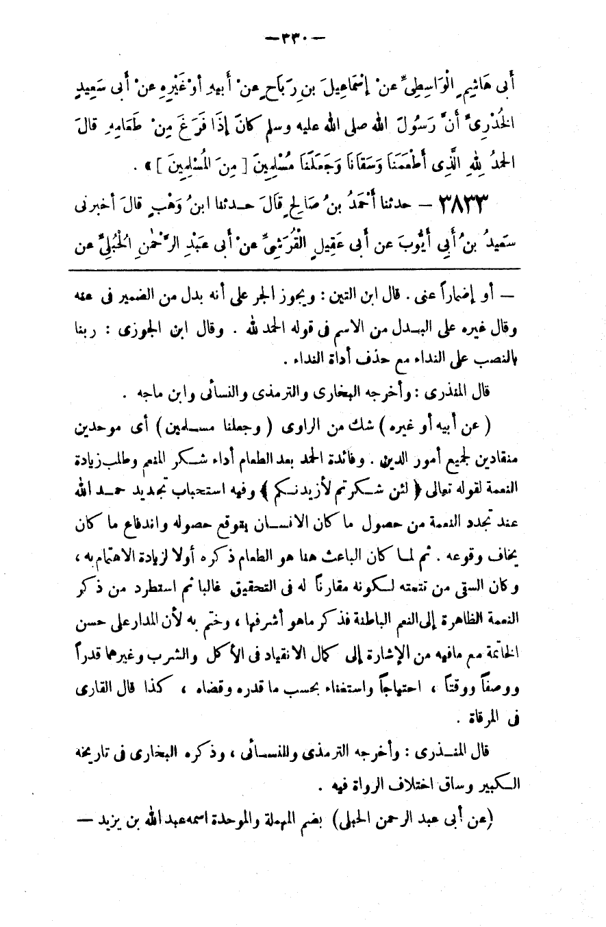 : أَيْ مُوَحِّدِينَ مُنْقَادِينَ لِجَمِيعِ أُمُور الدِّين . وَفَائِدَة الْحَمْد بَعْد الطَّعَام أَدَاء شُكْر الْمُنْعِم وَطَلَبُ زِيَادَة النِّعْمَة لِقَوْلِهِ تَعَالَى { لَئِنْ شَكَرْتُمْ لَأَزِيدَنكُمْ } وَفِيهِ اِسْتِحْبَاب تَجْدِيد حَمْد اللَّه عِنْد تَجَدُّدِ النِّعْمَة مِنْ حُصُول مَا كَانَ الْإِنْسَان يَتَوَقَّع حُصُوله وَانْدِفَاع مَا كَانَ يَخَاف وُقُوعه . ثُمَّ لَمَّا كَانَ الْبَاعِث هُنَا هُوَ الطَّعَام ذَكَرَهُ أَوَّلًا لِزِيَادَةِ الِاهْتِمَام بِهِ ، وَكَانَ السَّقْي مِنْ تَتِمَّته لِكَوْنِهِ مُقَارِنًا لَهُ فِي التَّحْقِيق غَالِبًا ثُمَّ اِسْتَطْرَدَ مِنْ ذِكْر النِّعْمَة الظَّاهِرَة إِلَى النِّعَم الْبَاطِنَة فَذَكَرَ مَا هُوَ أَشْرَفهَا ، وَخَتَمَ بِهِ لِأَنَّ الْمَدَار عَلَى حُسْن الْخَاتِمَة مَعَ مَا فِيهِ مِنْ الْإِشَارَة إِلَى كَمَالِ الِانْقِيَاد فِي الْأَكْل وَالشُّرْب وَغَيْرهمَا قَدْرًا وَوَصْفًا وَوَقْتًا ، اِحْتِيَاجًا وَاسْتِغْنَاء بِحَسَبِ مَا قَدَّرَهُ وَقَضَاهُ ، كَذَا قَالَ الْقَارِي فِي الْمِرْقَاة .