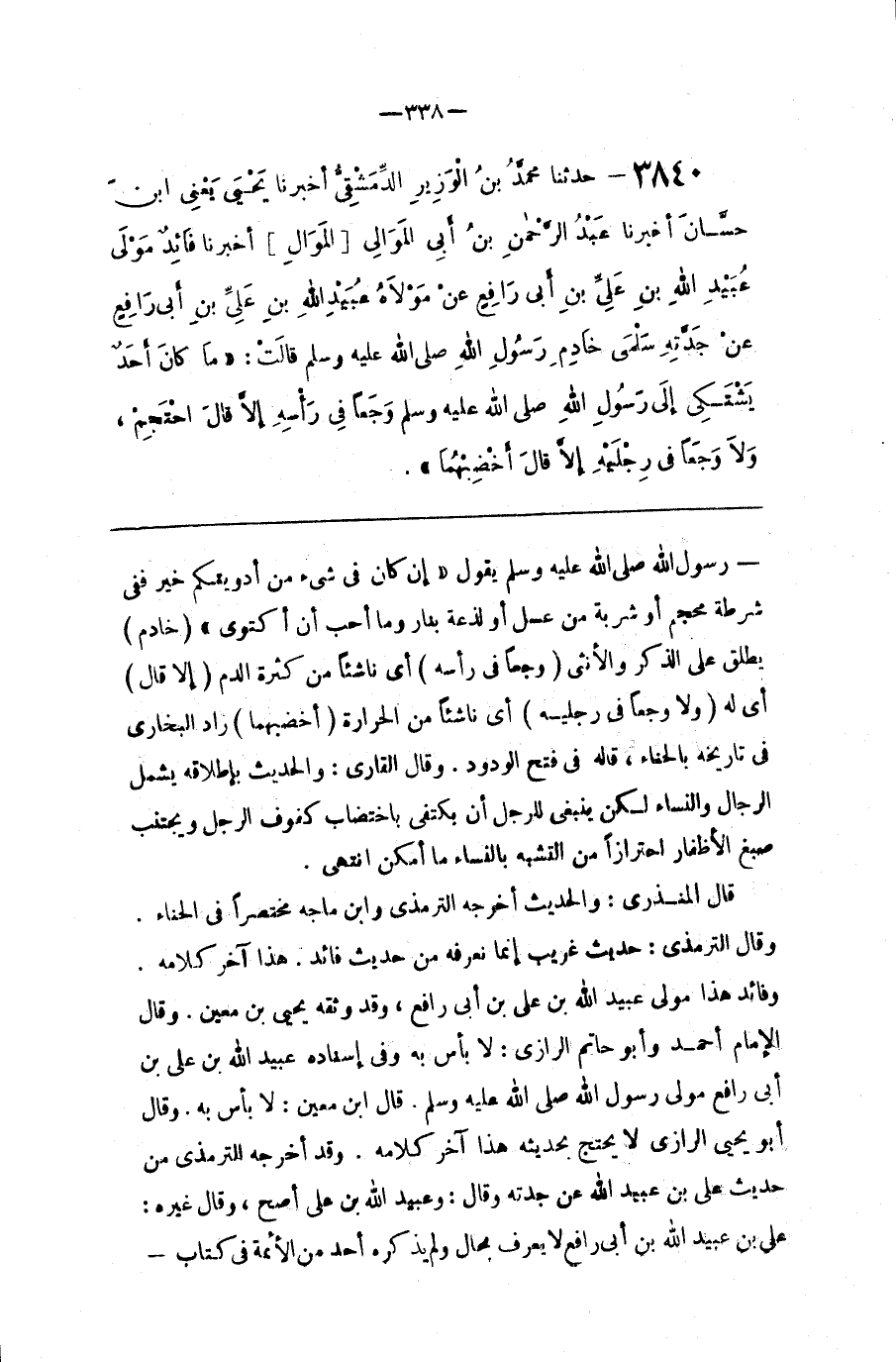 وَفَائِد هَذَا مَوْلَى عُبَيْد اللَّه بْن عَلِيّ بْن أَبِي رَافِع ، وَقَدْ وَثَّقَهُ يَحْيَى بْن مَعِين وَقَالَ الْإِمَام أَحْمَد وَأَبُو حَاتِم الرَّازِيُّ : لَا بَأْس بِهِ وَفِي إِسْنَاده عُبَيْد اللَّه بْن عَلِيّ بْن أَبِي رَافِع مَوْلَى رَسُول اللَّه صَلَّى اللَّه عَلَيْهِ وَسَلَّمَ قَالَ اِبْن مَعِين : لَا بَأْس بِهِ . وَقَالَ أَبُو يَحْيَى الرَّازِيُّ لَا يُحْتَجّ بِحَدِيثِهِ هَذَا آخِر كَلَامه . وَقَدْ أَخْرَجَهُ التِّرْمِذِيّ مِنْ حَدِيث عَلِيّ بْن عُبَيْد اللَّه عَنْ جَدَّته وَقَالَ : وَعُبَيْدِ اللَّه بْن عَلِيّ أَصَحّ ، وَقَالَ غَيْره : عَلِيّ بْن عُبَيْد اللَّه بْن أَبِي رَافِع لَا يُعْرَف بِحَالٍ وَلَمْ يَذْكُرهُ أَحَد مِنْ الْأَئِمَّة فِي كِتَاب @