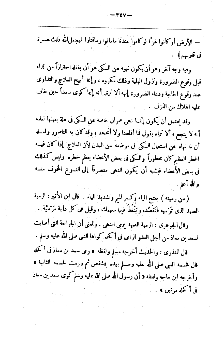 وَفِيهِ وَجْه آخَر وَهُوَ أَنْ يَكُون نَهْيه عَنْ الْكَيّ هُوَ أَنْ يَفْعَلهُ اِحْتِرَازًا مِنْ الدَّاء قَبْل وُقُوع الضَّرُورَة وَنُزُول الْبَلِيَّة وَذَلِكَ مَكْرُوه ، وَإِنَّمَا أُبِيحَ الْعِلَاج وَالتَّدَاوِي عِنْد وُقُوع الْحَاجَة وَدُعَاء الضَّرُورَة إِلَيْهِ أَلَا تَرَى أَنَّهُ إِنَّمَا كَوَى سَعْدًا حِين خَافَ عَلَيْهِ الْهَلَاك مِنْ النَّزْف .
