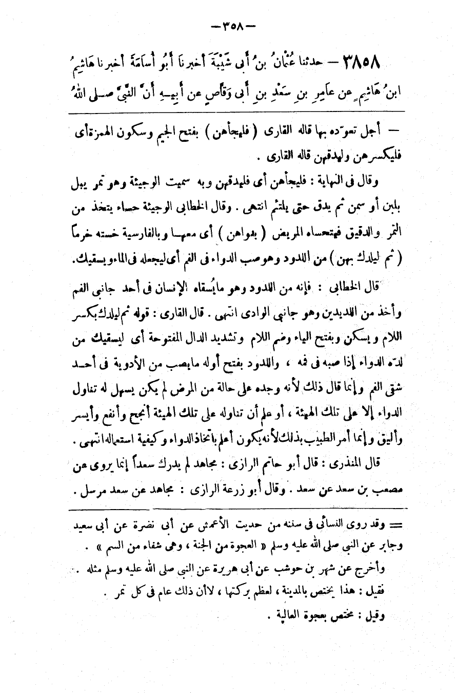 وقد روى النسائي في سننه من حديث الأعمش عن أبي نضرة عن أبي سعيد وجابر عن النبي صلى الله عليه و سلم العجوة من الجنة وهي شفاء من السم