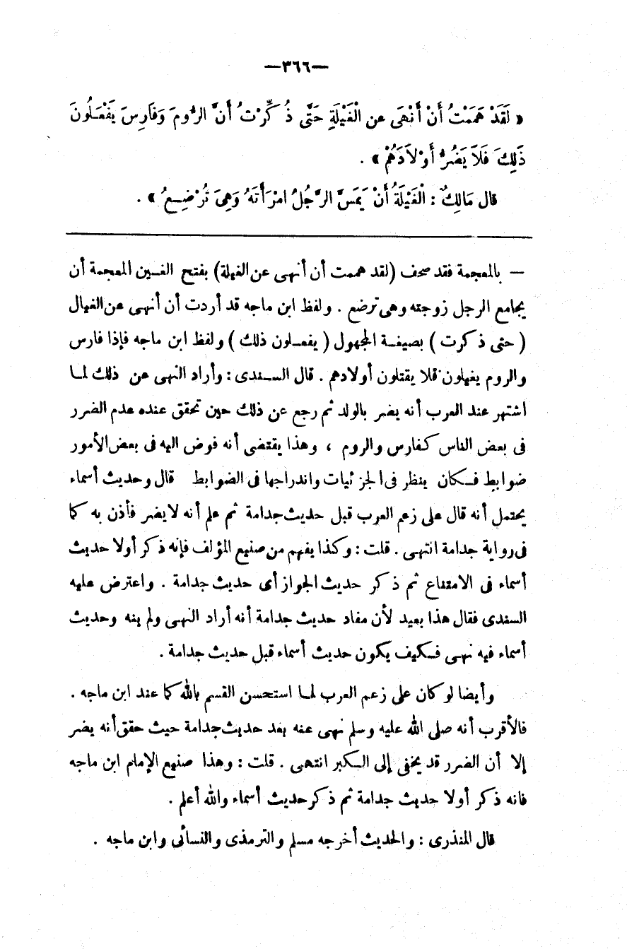 : وَلَفْظ اِبْن مَاجَهْ فَإِذَا فَارِس وَالرُّوم يَغِيلُونَ فَلَا يَقْتُلُونَ أَوْلَادهمْ . قَالَ السِّنْدِيُّ : وَأَرَادَ النَّهْي عَنْ ذَلِكَ لِمَا اُشْتُهِرَ عِنْد الْعَرَب أَنَّهُ يَضُرّ بِالْوَلَدِ ثُمَّ رَجَعَ عَنْ ذَلِكَ حِين تَحَقَّقَ عِنْده عَدَم الضَّرَر فِي بَعْض النَّاس كَفَارِسَ وَالرُّوم ، وَهَذَا يَقْتَضِي أَنَّهُ فَوَّضَ إِلَيْهِ فِي بَعْض الْأُمُور ضَوَابِط فَكَانَ يَنْظُر فِي الْجُزْئِيَّات وَانْدِرَاجهَا فِي الضَّوَابِط قَالَ وَحَدِيث أَسْمَاء يَحْتَمِل أَنَّهُ قَالَ عَلَى زَعْم الْعَرَب قَبْل حَدِيث جُدَامَة ثُمَّ عَلِمَ أَنَّهُ لَا يَضُرّ فَأَذِنَ بِهِ كَمَا فِي رِوَايَة جُدَامَة اِنْتَهَى . قُلْت : وَكَذَا يُفْهَم مِنْ صَنِيع الْمُؤَلِّف فَإِنَّهُ ذَكَرَ أَوَّلًا حَدِيث أَسْمَاء فِي الِامْتِنَاع ثُمَّ ذَكَرَ حَدِيث الْجَوَاز أَيْ حَدِيث جُدَامَة . وَاعْتَرَضَ عَلَيْهِ السِّنْدِيُّ فَقَالَ هَذَا بَعِيد لِأَنَّ مُفَاد حَدِيث جُدَامَة أَنَّهُ أَرَادَ النَّهْي وَلَمْ يَنْهَ وَحَدِيث أَسْمَاء فِيهِ نَهْي فَكَيْف يَكُون حَدِيث أَسْمَاء قَبْل حَدِيث جُدَامَة . وَأَيْضًا لَوْ كَانَ عَلَى زَعْم الْعَرَب لَمَا اِسْتَحْسَنَ الْقَسَم بِاَللَّهِ كَمَا عِنْد اِبْن مَاجَهْ . فَالْأَقْرَب أَنَّهُ صَلَّى اللَّه عَلَيْهِ وَسَلَّمَ نَهَى عَنْهُ بَعْد حَدِيث جُدَامَة حَيْثُ حُقِّقَ أَنَّهُ يَضُرّ إِلَّا أَنَّ الضَّرَر قَدْ يَخْفَى إِلَى الْكِبَر اِنْتَهَى .