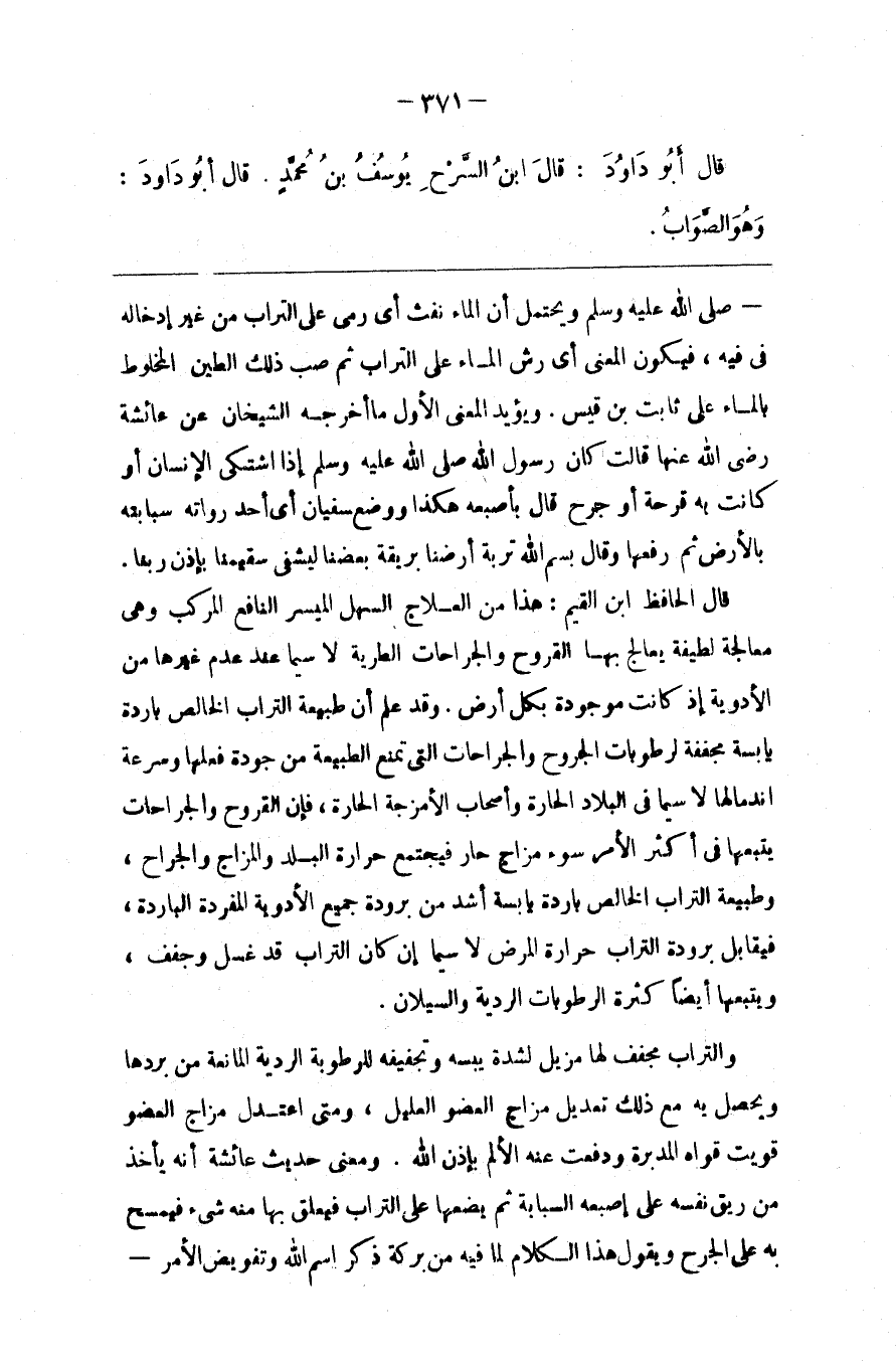 قَالَ الْحَافِظ اِبْن الْقَيِّم : هَذَا مِنْ الْعِلَاج السَّهْل الْمُيَسَّر النَّافِع الْمُرَكَّب وَهِيَ مُعَالَجَة لَطِيفَة يُعَالَج بِهَا الْقُرُوح وَالْجِرَاحَات الطَّرِيَّة لَا سِيَّمَا عِنْد عَدَم غَيْرهَا مِنْ الْأَدْوِيَة إِذْ كَانَتْ مَوْجُودَة بِكُلِّ أَرْض . وَقَدْ عُلِمَ أَنَّ طَبِيعَة التُّرَاب الْخَالِص بَارِدَة يَابِسَة مُجَفِّفَة لِرُطُوبَاتِ الْجُرُوح وَالْجِرَاحَات الَّتِي تَمْنَع الطَّبِيعَة مِنْ جَوْدَة فِعْلهَا وَسُرْعَة اِنْدِمَالهَا لَا سِيَّمَا فِي الْبِلَاد الْحَارَّة وَأَصْحَاب الْأَمْزِجَة الْحَارَّة ، فَإِنَّ الْقُرُوح وَالْجِرَاحَات يَتْبَعهَا فِي أَكْثَر الْأَمْر سُوء مِزَاج حَارّ فَيَجْتَمِع حَرَارَة الْبَلَد وَالْمِزَاج وَالْجِرَاح ، وَطَبِيعَة التُّرَاب الْخَالِص بَارِدَة يَابِسَة أَشَدّ مِنْ بُرُودَة جَمِيع الْأَدْوِيَة الْمُفْرَدَة الْبَارِدَة ، فَيُقَابِل بُرُودَة التُّرَاب حَرَارَة الْمَرَض لَا سِيَّمَا إِنْ كَانَ التُّرَاب قَدْ غُسِلَ وَجُفِّفَ ، وَيَتْبَعهَا أَيْضًا كَثْرَة الرُّطُوبَات الرَّدِيَّة وَالسَّيْلَانِ .
