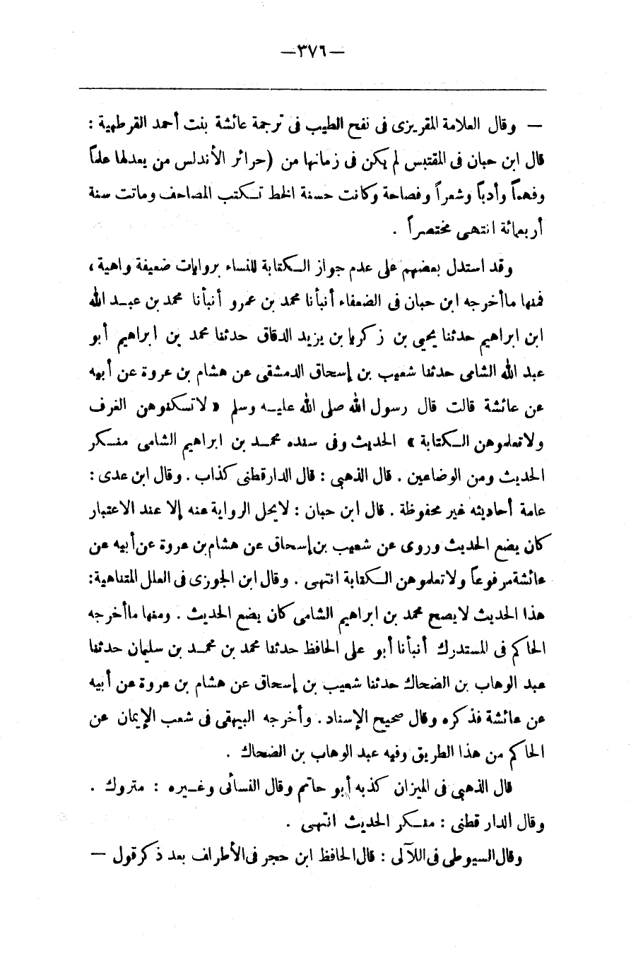 وَقَالَ الْعَلَّامَة الْمَقَّرِيّ فِي نَفْحِ الطِّيب فِي تَرْجَمَة عَائِشَة بِنْت أَحْمَد الْقُرْطُبِيَّة : قَالَ اِبْن حِبَّان فِي الْمُقْتَبَس لَمْ يَكُنْ فِي زَمَانهَا مِنْ حَرَائِر الْأَنْدَلُس مِنْ يَعْدِلهَا عِلْمًا وَفَهْمًا وَأَدَبًا وَشِعْرًا وَفَصَاحَة وَكَانَتْ حَسَنَة الْخَطّ تَكْتُب الْمَصَاحِف وَمَاتَتْ سَنَةَ أَرْبَعِمِائَةٍ اِنْتَهَى مُخْتَصَرًا .