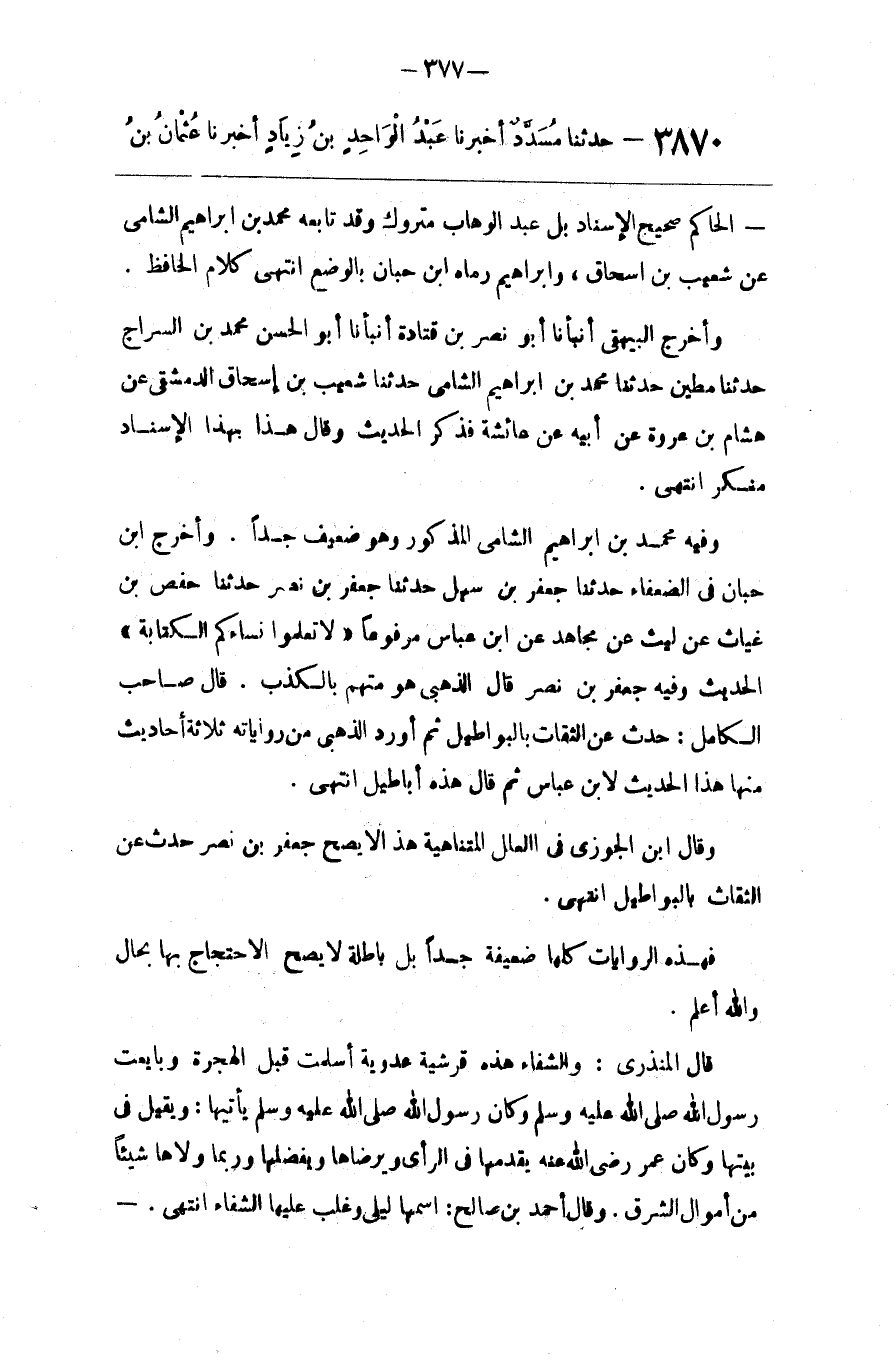 وَفِيهِ مُحَمَّد بْن إِبْرَاهِيم الشَّامِيّ الْمَذْكُور وَهُوَ ضَعِيف جِدًّا . وَأَخْرَجَهُ اِبْن حِبَّان فِي الضُّعَفَاء حَدَّثَنَا جَعْفَر بْن سَهْل حَدَّثَنَا جَعْفَر بْن نَصْر حَدَّثَنَا حَفْص بْن غِيَاث عَنْ لَيْث عَنْ مُجَاهِد عَنْ اِبْن عَبَّاس مَرْفُوعًا " لَا تُعَلِّمُوا نِسَاءَكُمْ الْكِتَابَة " الْحَدِيث وَفِيهِ جَعْفَر بْن نَصْر قَالَ الذَّهَبِيّ هُوَ مُتَّهَم بِالْكَذِبِ . قَالَ صَاحِب الْكَامِل : حَدَّثَ عَنْ الثِّقَات بِالْبَوَاطِيلِ ثُمَّ أَوْرَدَ الذَّهَبِيّ مِنْ رِوَايَاته ثَلَاثَة أَحَادِيث مِنْهَا هَذَا الْحَدِيث لِابْنِ عَبَّاس ثُمَّ قَالَ هَذِهِ أَبَاطِيل اِنْتَهَى .