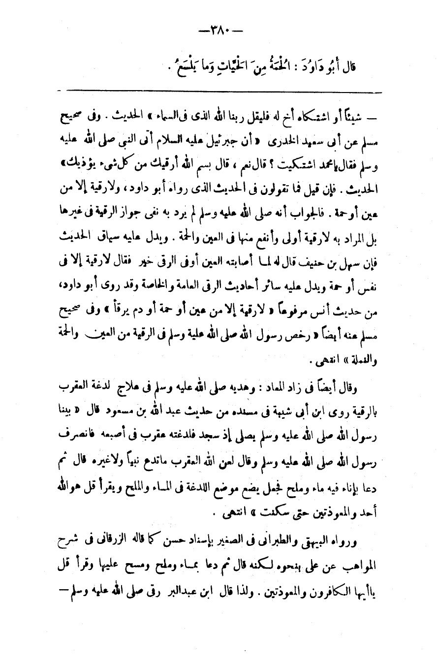 وَقَالَ أَيْضًا فِي زَادَ الْمَعَاد : وَهَدْيه صَلَّى اللَّه عَلَيْهِ وَسَلَّمَ فِي عِلَاج لَدْغَة الْعَقْرَب بِالرُّقْيَةِ رَوَى اِبْن أَبِي شَيْبَة فِي مُسْنَده مِنْ حَدِيث عَبْد اللَّه بْن مَسْعُود قَالَ " بَيْنَا رَسُول اللَّه صَلَّى اللَّه عَلَيْهِ وَسَلَّمَ يُصَلِّي إِذْ سَجَدَ فَلَدَغَتْهُ عَقْرَب فِي أُصْبُعه فَانْصَرَفَ رَسُول اللَّه صَلَّى اللَّه عَلَيْهِ وَسَلَّمَ وَقَالَ لَعَنَ اللَّه الْعَقْرَب مَا تَدَع نَبِيًّا وَلَا غَيْره قَالَ ثُمَّ دَعَا بِإِنَاءٍ فِيهِ مَاء وَمِلْح فَجَعَلَ يَضَع مَوْضِع اللَّدْغَة فِي الْمَاء وَالْمِلْح وَيَقْرَأ قُلْ هُوَ اللَّه أَحَد وَالْمُعَوِّذَتَيْنِ حَتَّى سَكَنَتْ " اِنْتَهَى .