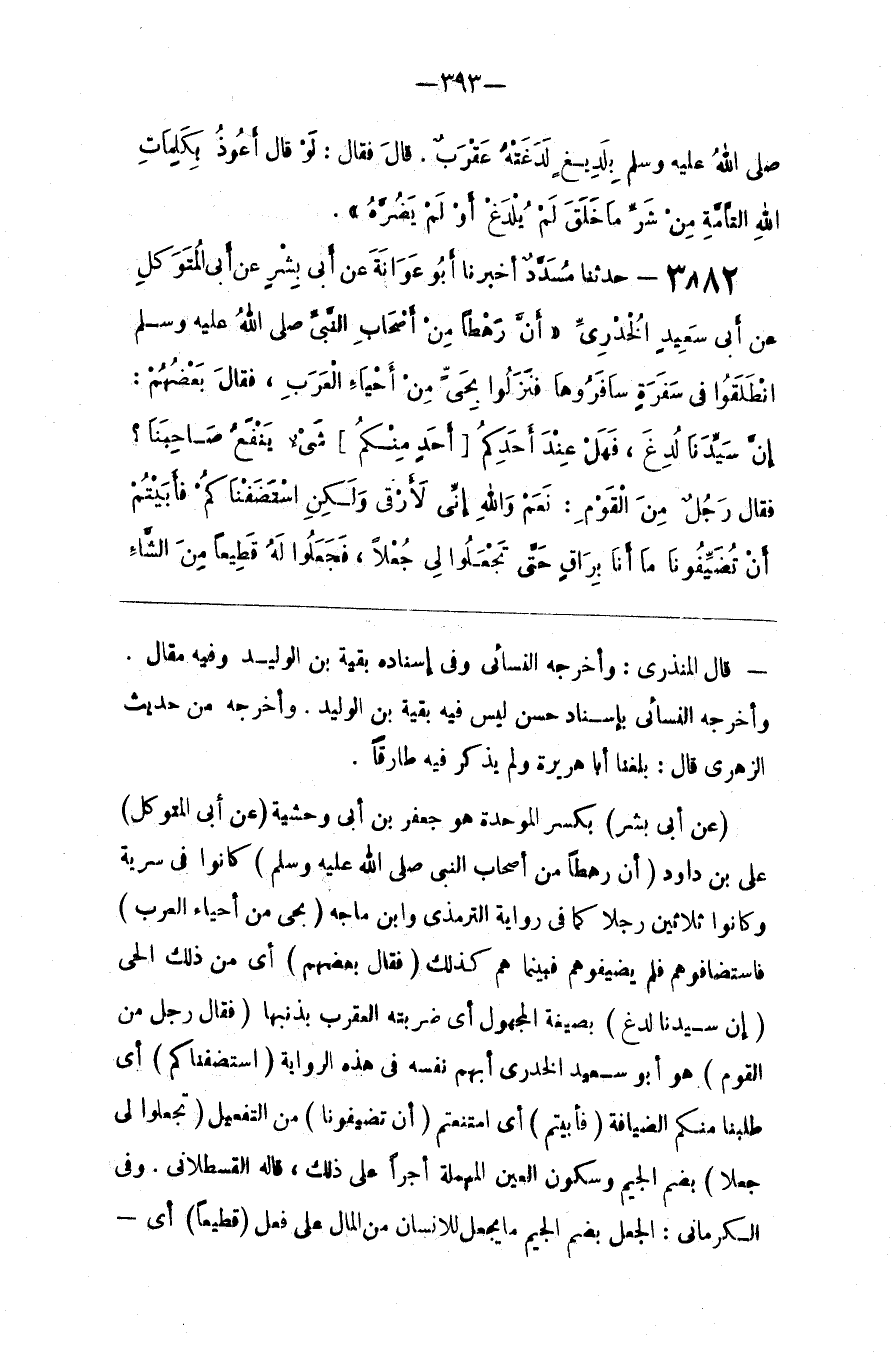 قَالَ الْمُنْذِرِيُّ : وَأَخْرَجَهُ النَّسَائِيُّ وَفِي إِسْنَاده بَقِيَّة بْن الْوَلِيد وَفِيهِ مَقَال وَأَخْرَجَهُ النَّسَائِيُّ بِإِسْنَادٍ حَسَن لَيْسَ فِيهِ بَقِيَّة بْن الْوَلِيد . وَأَخْرَجَهُ مِنْ حَدِيث الزُّهْرِيّ قَالَ : بَلَغَنَا أَبَا هُرَيْرَة وَلَمْ يَذْكُر فِيهِ طَارِقًا .