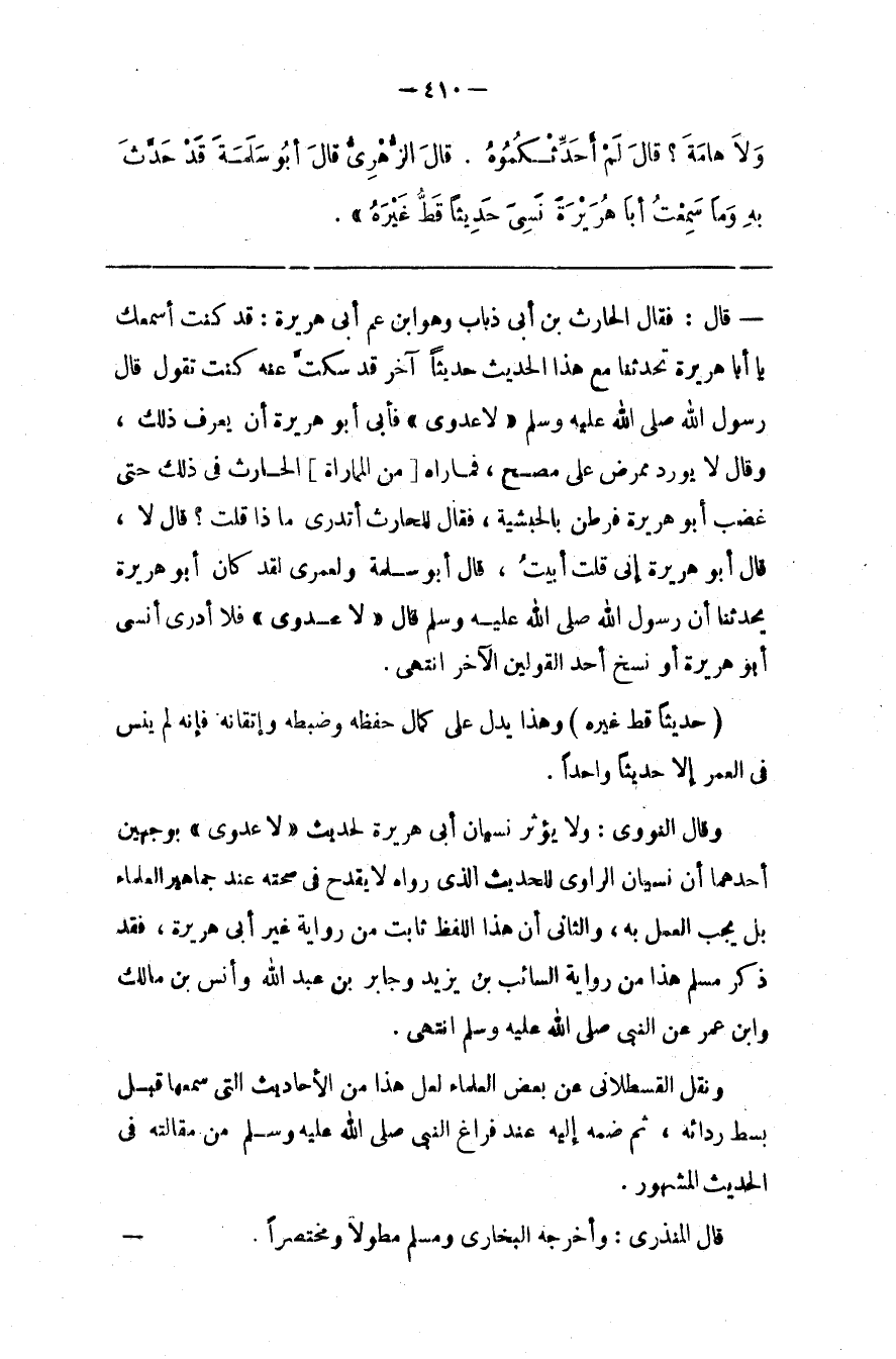 قَالَ : فَقَالَ الْحَارِث بْن أَبِي ذُبَاب وَهُوَ اِبْن عَمّ أَبِي هُرَيْرَة : قَدْ كُنْت أَسْمَعك يَا أَبَا هُرَيْرَة تُحَدِّثنَا مَعَ هَذَا الْحَدِيث حَدِيثًا آخَر قَدْ سَكَتّ عَنْهُ كُنْت تَقُول قَالَ رَسُول اللَّه صَلَّى اللَّه عَلَيْهِ وَسَلَّمَ " لَا عَدْوَى " فَأَبَى أَبُو هُرَيْرَة أَنْ يُعَرِّف ذَلِكَ ، وَقَالَ لَا يُورِد مُمْرِض عَلَى مُصِحّ ، فَمَارَاهُ [ مِنْ الْمُمَارَاة ] الْحَارِث فِي ذَلِكَ حَتَّى غَضِبَ أَبُو هُرَيْرَة فَرَطَنَ بِالْحَبَشِيَّةِ ، فَقَالَ لِلْحَارِثِ أَتَدْرِي مَا قُلْت ؟ قَالَ لَا ، قَالَ أَبُو هُرَيْرَة إِنَى قُلْت أَبَيْت ، قَالَ أَبُو سَلَمَة وَلَعَمْرِي لَقَدْ كَانَ أَبُو هُرَيْرَة يُحَدِّثنَا أَنَّ رَسُول اللَّه صَلَّى اللَّه عَلَيْهِ وَسَلَّمَ قَالَ " لَا عَدْوَى " فَلَا أَدْرِي أَنَسِيَ أَبُو هُرَيْرَة أَوْ نَسَخَ أَحَد الْقَوْلَيْنِ الْآخَر اِنْتَهَى .