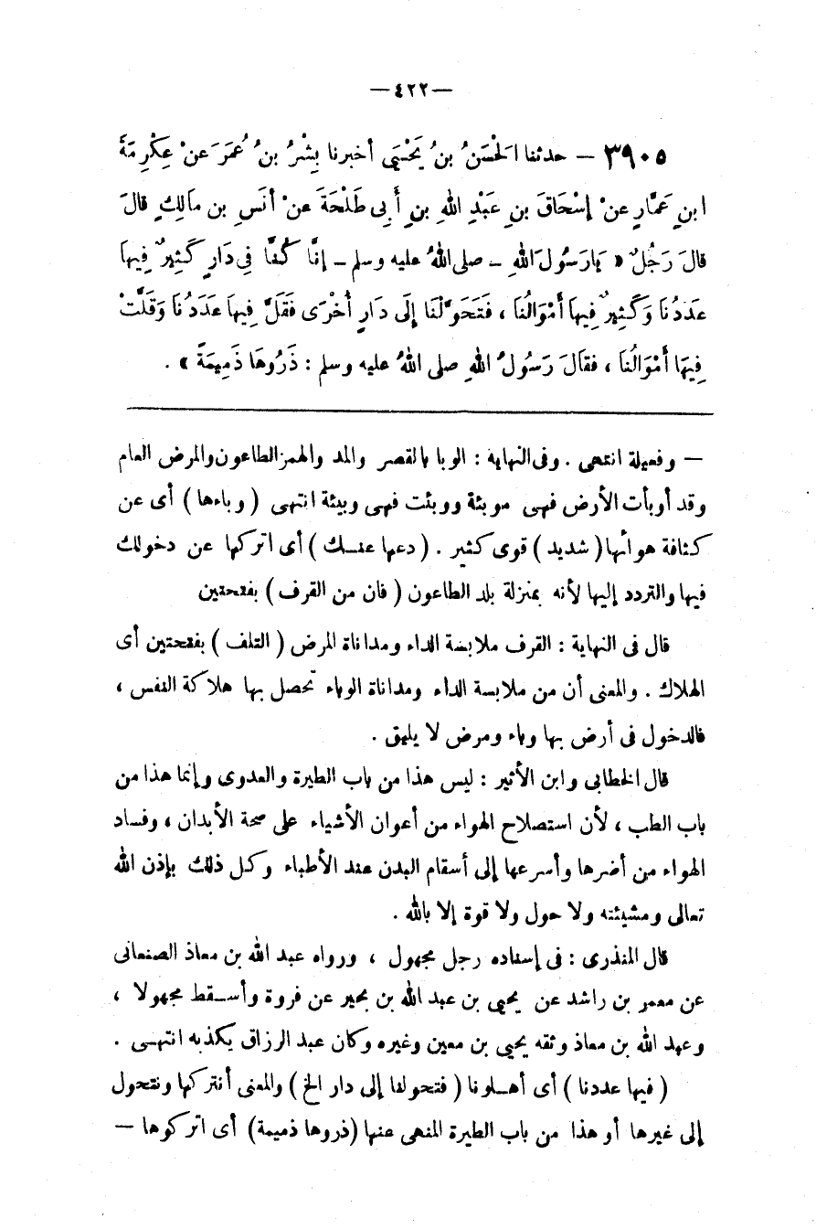قَالَ الْخَطَّابِيُّ وَابْن الْأَثِير : لَيْسَ هَذَا مِنْ بَاب الطِّيَرَة وَالْعَدْوَى وَإِنَّمَا هَذَا مِنْ بَاب الطِّبّ ؛ لِأَنَّ اِسْتِصْلَاح الْهَوَاء مِنْ أَعْوَان الْأَشْيَاء عَلَى صِحَّة الْأَبَدَانِ ، وَفَسَاد الْهَوَاء مِنْ أَضَرّهَا وَأَسْرَعِهَا إِلَى إِسْقَام الْبَدَن عِنْد الْأَطِبَّاء وَكُلّ ذَلِكَ بِإِذْنِ اللَّه تَعَالَى وَمَشِيئَته وَلَا حَوْل وَلَا قُوَّة إِلَّا بِاَللَّهِ .