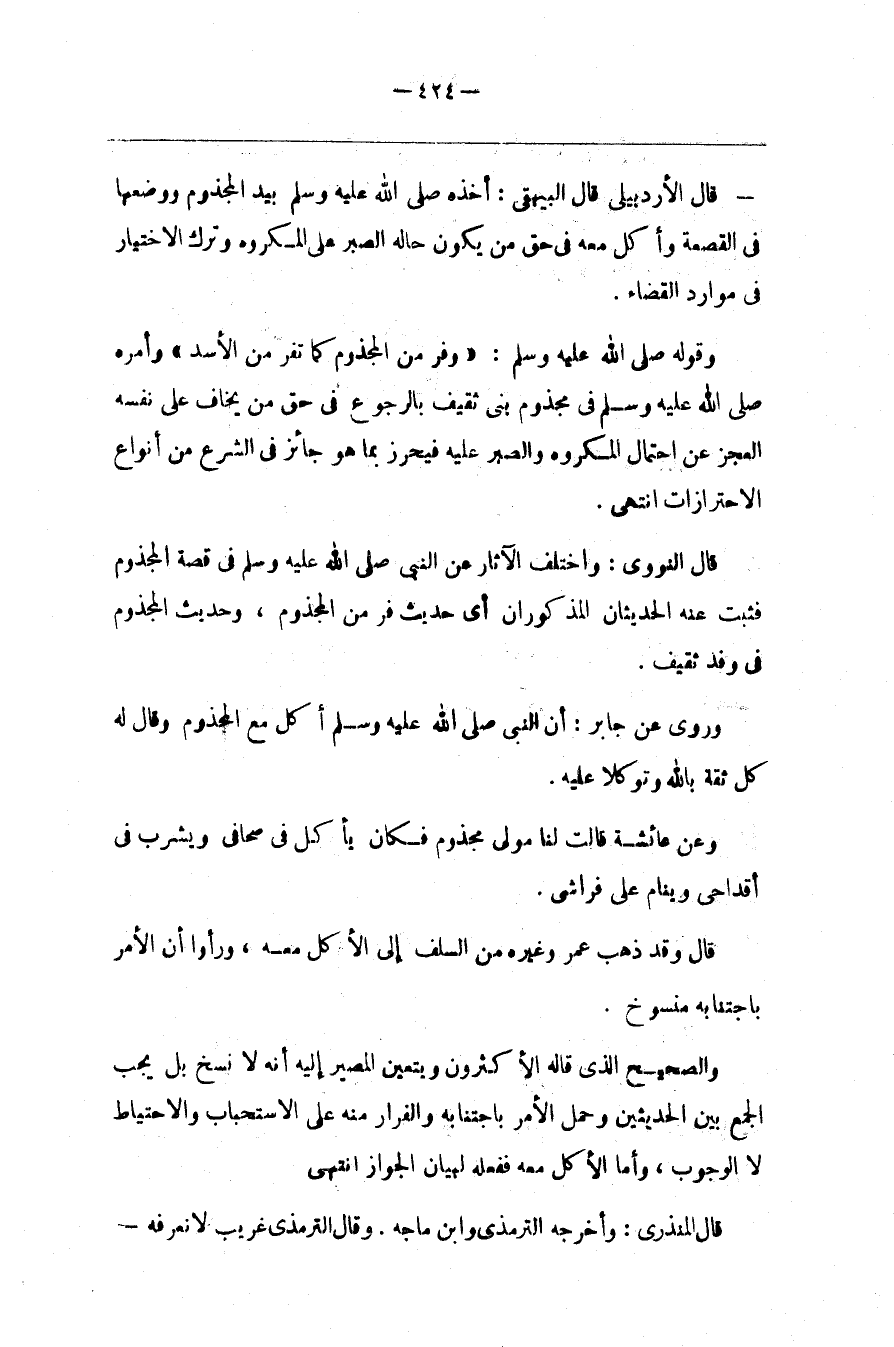 قَالَ الْأَرْدَبِيلِيّ قَالَ الْبَيْهَقِيُّ : أَخْذه صَلَّى اللَّه عَلَيْهِ وَسَلَّمَ بِيَدِ الْمَجْذُوم وَوَضْعهَا فِي الْقَصْعَة وَأَكْله مَعَهُ فِي حَقّ مَنْ يَكُون حَاله الصَّبْر عَلَى الْمَكْرُوه وَتَرْك الِاخْتِيَار فِي مَوَارِد الْقَضَاء .