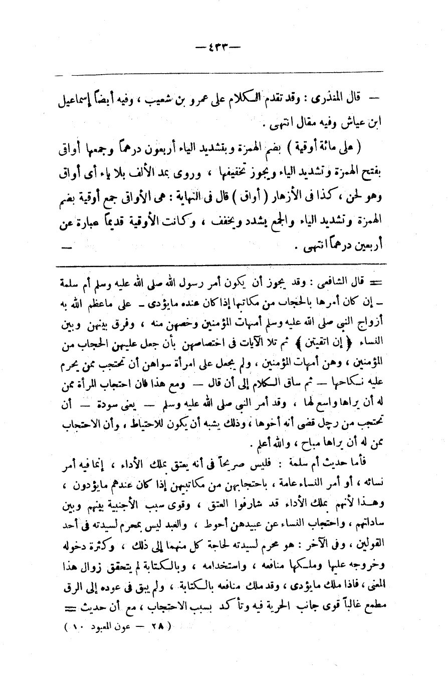 قال الشافعي وقد يجوز أن يكون أمر رسول الله أم سلمة إن كان أمرها بالحجاب من مكاتبها إذا كان عنده ما يؤدي على ما عظم الله به أزواج النبي أمهات المؤمنين وخصهن منه وفرق بينهن وبين النساء إن اتقيتن ثم تلا الآيات في اختصاصهن بأن جعل عليهن الحجاب من المؤمنين وهن أمهات المؤمنين ولم يجعل على امرأة سواهن أن تحتجب ممن يحرم عليه نكاحها ثم ساق الكلام إلى أن قال ومع هذا فإن احتجاب المرأة ممن له أن يراها واسع لها وقد أمر النبي يعني سودة أن تحتجب من رجل قضى أنه أخوها وذلك يشبه أن يكون للاحتياط وأن الاحتجاب ممن له أن يراها مباح والله أعلم