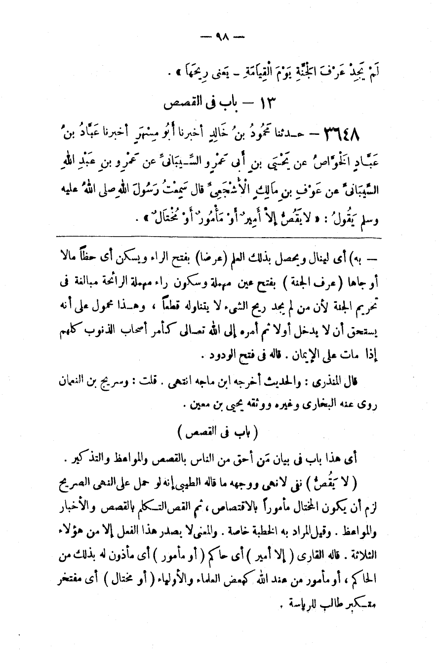 : نَفْي لَا نَهْي وَوَجْهه مَا قَالَهُ الطِّيبِيُّ إِنَّهُ لَوْ حُمِلَ عَلَى النَّهْي الصَّرِيح لَزِمَ أَنْ يَكُون الْمُخْتَال مَأْمُورًا بِالِاقْتِصَاصِ ، ثُمَّ الْقَصّ التَّكَلُّم بِالْقَصَصِ وَالْأَخْبَار وَالْمَوَاعِظ . وَقِيلَ الْمُرَاد بِهِ الْخُطْبَة خَاصَّة . وَالْمَعْنَى لَا يَصْدُر هَذَا الْفِعْل إِلَّا مِنْ هَؤُلَاءِ الثَّلَاثَة . قَالَهُ الْقَارِي