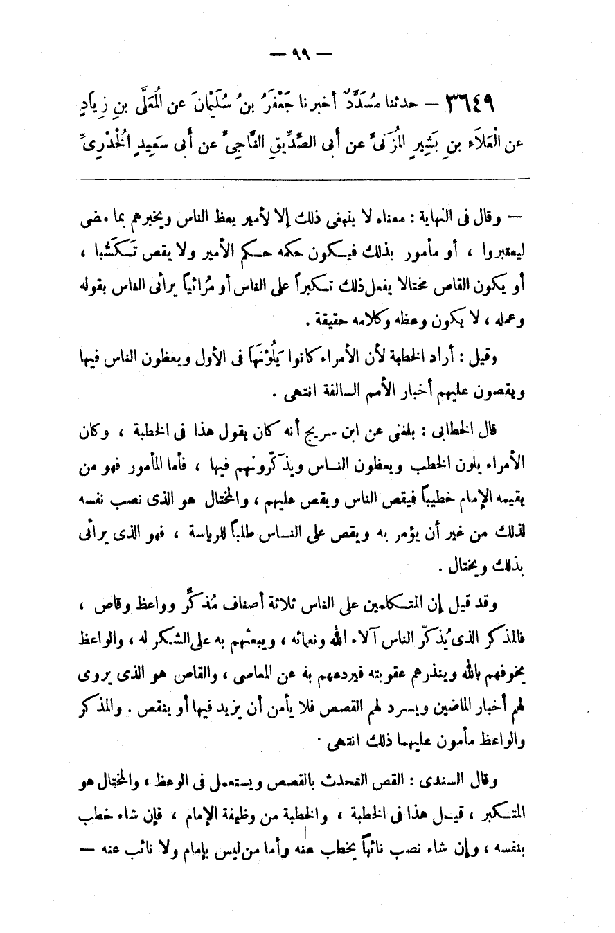 وَقَالَ فِي النِّهَايَة : مَعْنَاهُ لَا يَنْبَغِي ذَلِكَ إِلَّا لِأَمِيرٍ يَعِظ النَّاس وَيُخْبِرهُمْ بِمَا مَضَى لِيَعْتَبِرُوا ، أَوْ مَأْمُور بِذَلِكَ فَيَكُون حُكْمه حُكْم الْأَمِير وَلَا يَقُصّ تَكَسُّبًا ، أَوْ يَكُون الْقَاصّ مُخْتَالًا يَفْعَل ذَلِكَ تَكَبُّرًا عَلَى النَّاس أَوْ مُرَائِيًا يُرَائِي النَّاس بِقَوْلِهِ وَعِلْمه ، لَا يَكُون وَعْظه وَكَلَامه حَقِيقَة .