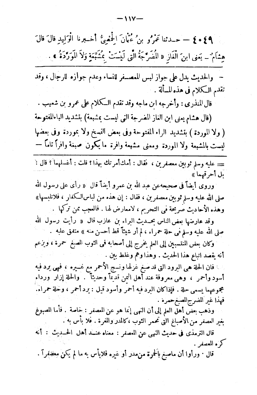 وكان بعض المنتسبين إلى العلم يخرج إلى أصحابه في الثوب المصبغ حمرة ويزعم أنه يقصد اتباع هذا الحديث