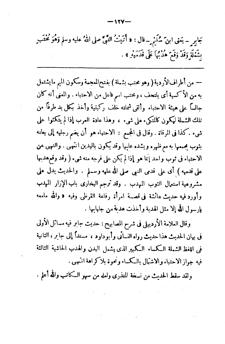 وَقَالَ الْعَلَّامَة الْأَرْدَبِيلِيُّ فِي شَرْح الْمَصَابِيح : حَدِيث جَابِر فِيهِ مَسَائِل الْأُولَى فِي بَيَان الْحَدِيث هَذَا حَدِيث رَوَاهُ النَّسَائِيُّ وَأَبُو دَاوُدَ ، مُسْنَدًا إِلَى جَابِر ، الثَّانِيَة فِي اللَّفْظ الشَّمْلَة الْكِسَاء الْكَبِير الَّذِي يَشْمَل الْبَدَن وَالْهُدْب الْحَاشِيَة الثَّالِثَة فِيهِ جَوَاز الِاحْتِبَاء وَالِاشْتِمَال بِالْكِسَاءِ وَنَحْوه بِلَا كَرَاهَة اِنْتَهَى .