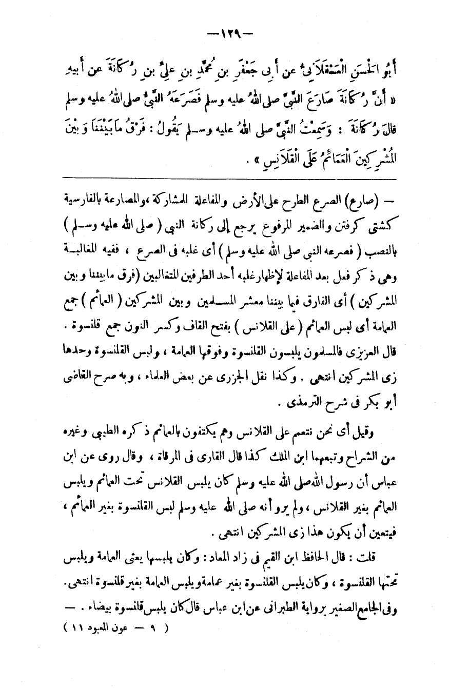 وَقِيلَ أَيْ نَحْنُ نَتَعَمَّم عَلَى الْقَلَانِس وَهُمْ يَكْتَفُونَ بِالْعَمَائِمِ ذَكَرَهُ الطِّيبِيُّ وَغَيْره مِنْ الشُّرَّاح وَتَبِعَهُمَا اِبْن الْمَلَك كَذَا قَالَ الْقَارِي فِي الْمِرْقَاة ، وَقَالَ رُوِيَ عَنْ اِبْن عَبَّاس أَنَّ رَسُول اللَّه صَلَّى اللَّه عَلَيْهِ وَسَلَّمَ كَانَ يَلْبَس الْقَلَانِس تَحْت الْعَمَائِم وَيَلْبَس الْعَمَائِم بِغَيْرِ الْقَلَانِس ، وَلَمْ يُرْوَ أَنَّهُ صَلَّى اللَّه عَلَيْهِ وَسَلَّمَ لَبِسَ الْقَلَنْسُوَة بِغَيْرِ الْعَمَائِم ، فَيَتَعَيَّن أَنْ يَكُون هَذَا زِيّ الْمُشْرِكِينَ اِنْتَهَى .